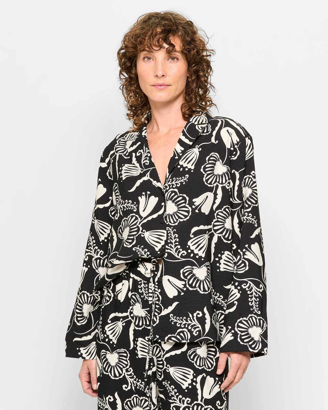 Experience the perfect blend of style and comfort with this women's long sleeve print shirt. Made from a viscose and nylon mix, this shirt offers a lightweight feel that ensures all-day comfort. The black and white francine floral print is both chic and versatile, making it suitable for a variety of occasions. Designed with a round collared neckline, front lapels, and a v-drop, this shirt also features a button through front and a curved hemline. The back yoke panel with a centre pleat allows for added movement and a flattering silhouette. Whether you're dressing up for a special event or keeping it casual, this shirt is a must-have for your wardrobe.