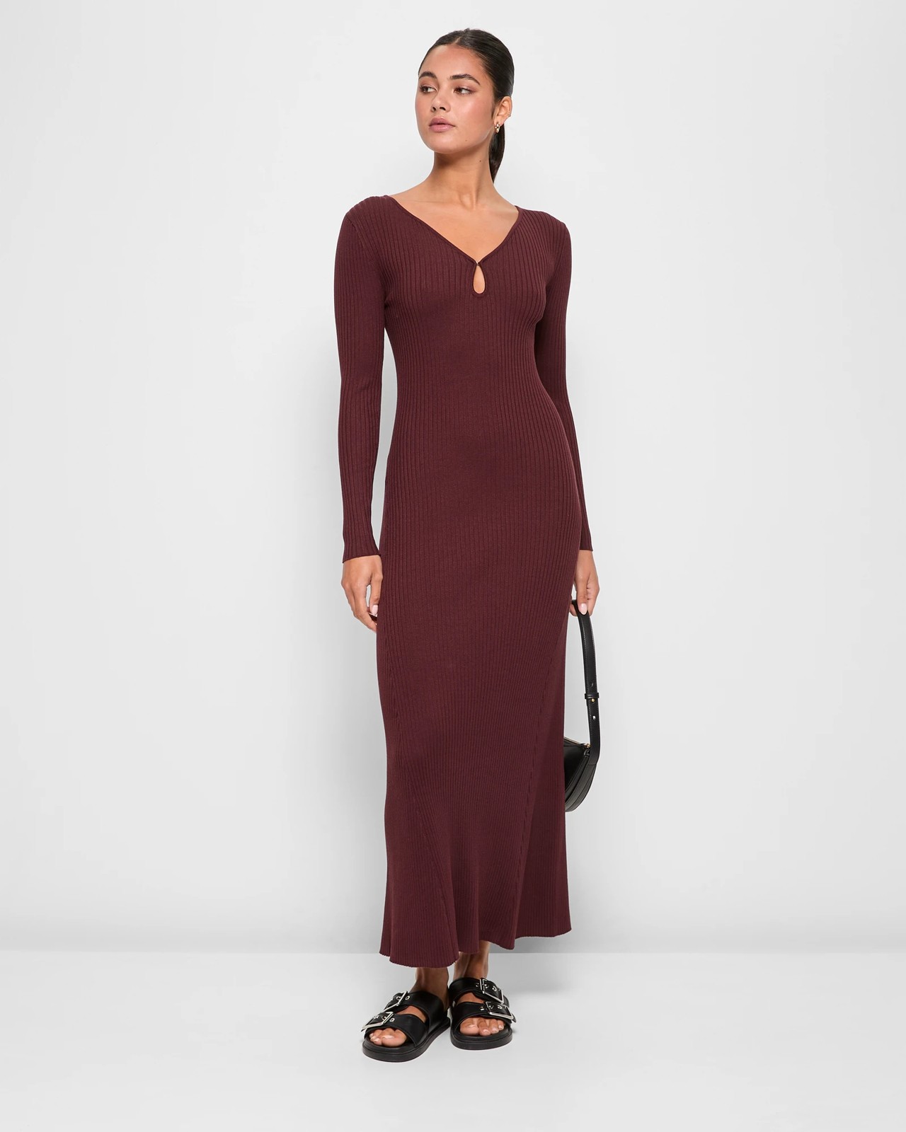 Step into classic style with the Long Sleeve Rib Detail Knit Midi Dress from Lily Loves. This beautifully designed piece boasts a rich chocolate brown hue and features an all-over ribbed knit that gently enhances your figure. The V-neckline with a chic front keyhole adds a touch of sophistication, while the A-line cut skirt offers a timeless midi length for versatile styling. Lightweight yet warm, this dress is perfect for both casual outings and formal gatherings. Enjoy the comfort and charm as you make a statement in unmatched fashion. Add it to your wardrobe and experience effortless charm.