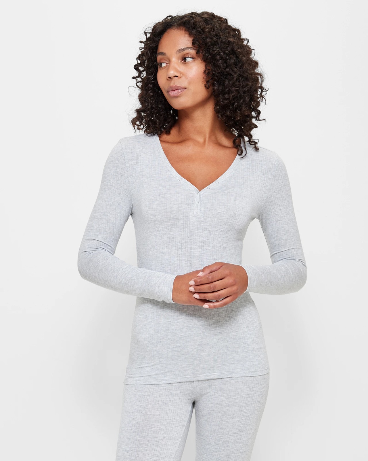Introducing our Long Sleeve Rib Under Top for women. This top is made from a fabric blend that includes modal, ensuring a soft and comfortable feel. The stretchy material allows for a perfect fit, while the all-over ribbed design adds a touch of style. With its V-neckline and push stud closure front, this top is not only versatile but also trendy. The straight hemline and long sleeves complete the look. Whether you want to layer it under your clothes or wear it to bed with the matching pants (sold separately), this top is a must-have addition to your wardrobe. Upgrade your comfort and style now!