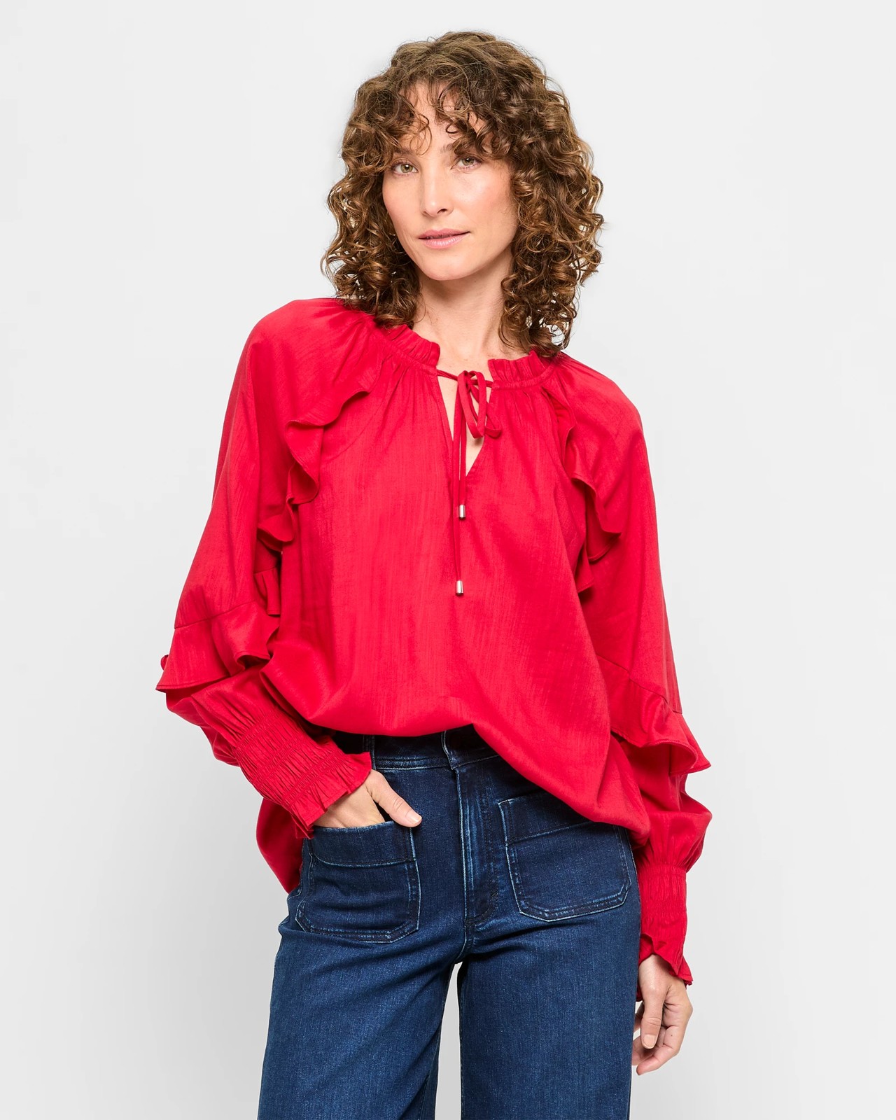Step up your wardrobe game with the Long Sleeve Ruffle Detail Blouse for women. Made from a delightful blend of cotton and viscose, this blouse promises comfort and breathability. Available in vibrant Rosso red, it features a charming frilled round neckline with a tie detail at the front for added flair. The blouse is designed with long sleeves that have shirred cuffs and delightful ruffles cascading down the shoulders and arms. A curved hemline completes the look, making it a versatile choice for any occasion. Don't miss out on this stylish must-have.