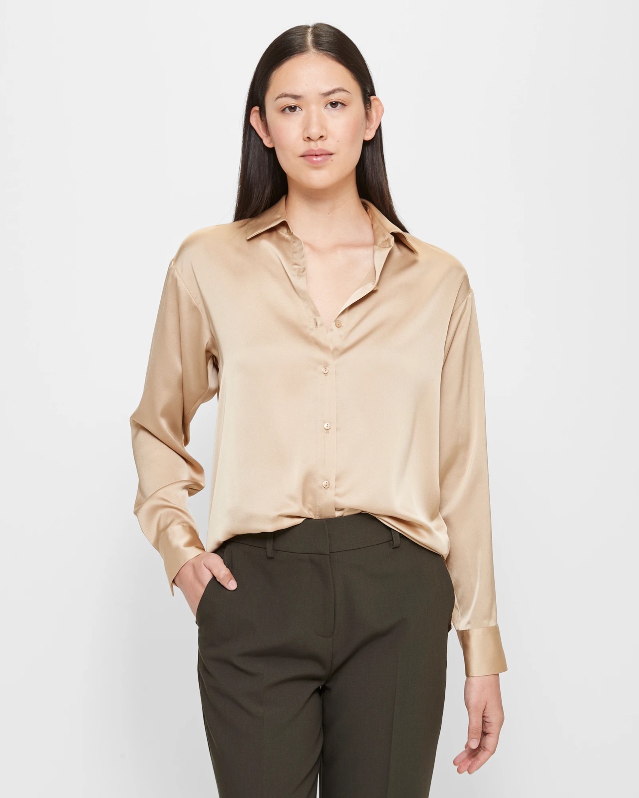 Welcome to your new wardrobe staple: the Long Sleeve Satin Shirt. Embrace luxurious comfort with a soft satin feel and a tailored, regular fit. The round collared neckline and long button cuff sleeves exude sophistication, while the curved high-low hemline adds a stylish touch. Designed with a back centre pleat for added movement, perfect for busy days on the move. Elevate your look and order your own Long Sleeve Satin Shirt today!
