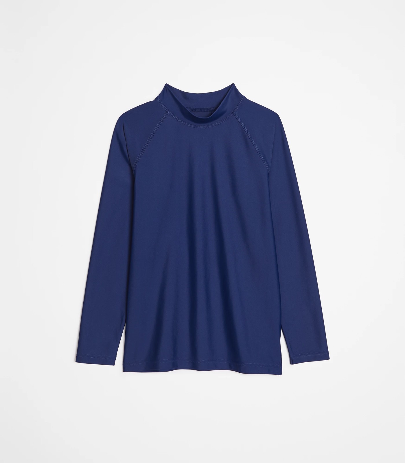 Stay protected from the sun while swimming with this Long Sleeve School Swim Rashie. Crafted using recycled polyester and featuring UPF 50+ sun protection, it has great stretch with a regular fit and navy blue color. The stand collar, long raglan sleeves and straight hem allow for full range of movement in the water. An inner name tag provides extra convenience.