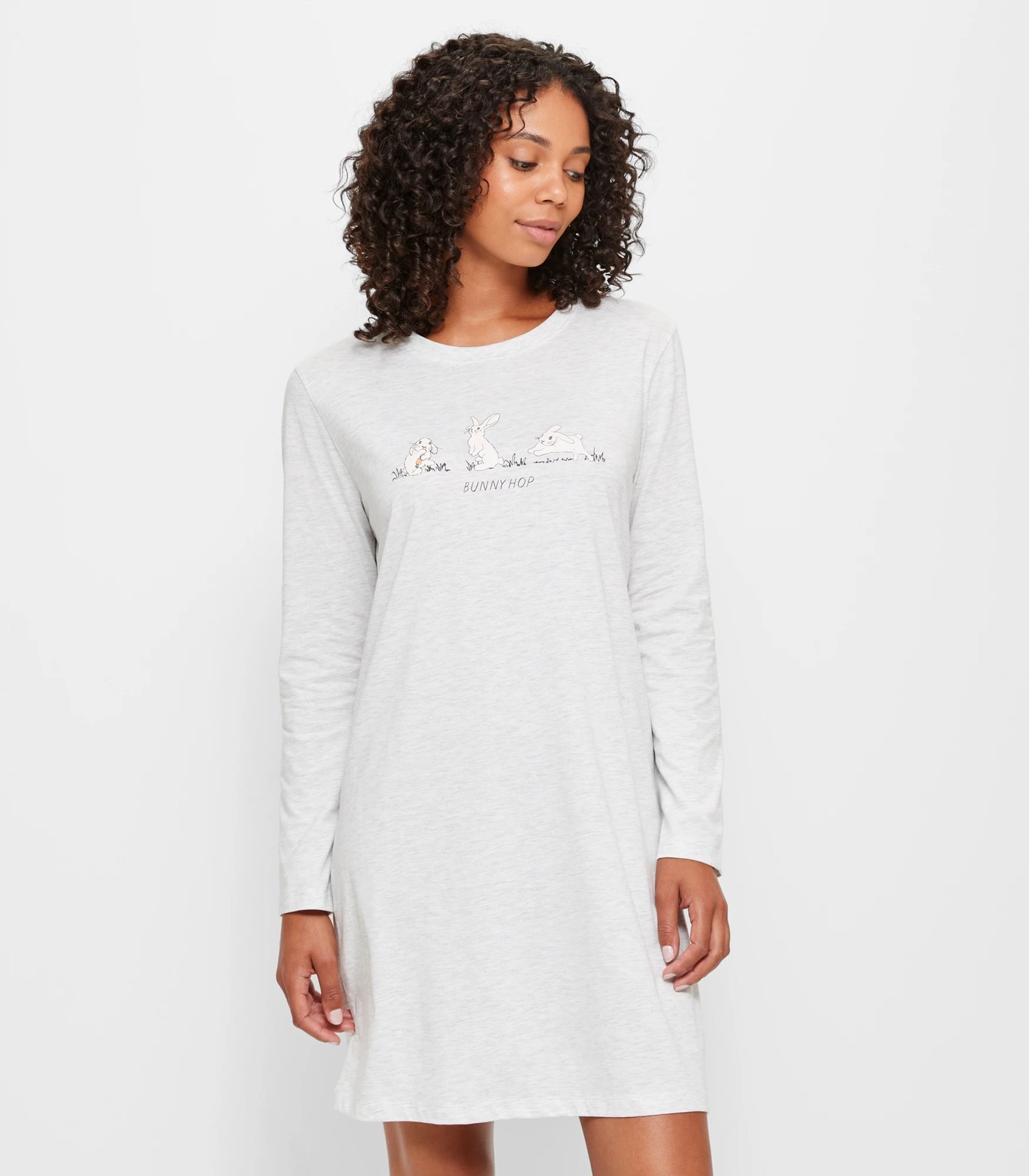 Get ready for a cosy and stylish night's sleep with our Long Sleeve Sleep T-Shirt Nightie. Made from a soft and breathable cotton/viscose blend, this nightie is designed for maximum comfort and a perfect fit. It features a ribbed crew neckline and long sleeves to keep you warm during the cooler nights. The bold chest print of a cute bunny with the wording 'BUNNY HOP' adds a fun and festive touch. With its long length and straight hemline, this nightie is perfect for lounging around the house or enjoying a good night's sleep. Upgrade your sleepwear collection and embrace sleep with our Long Sleeve Sleep T-Shirt Nightie. Order now and experience ultimate comfort!