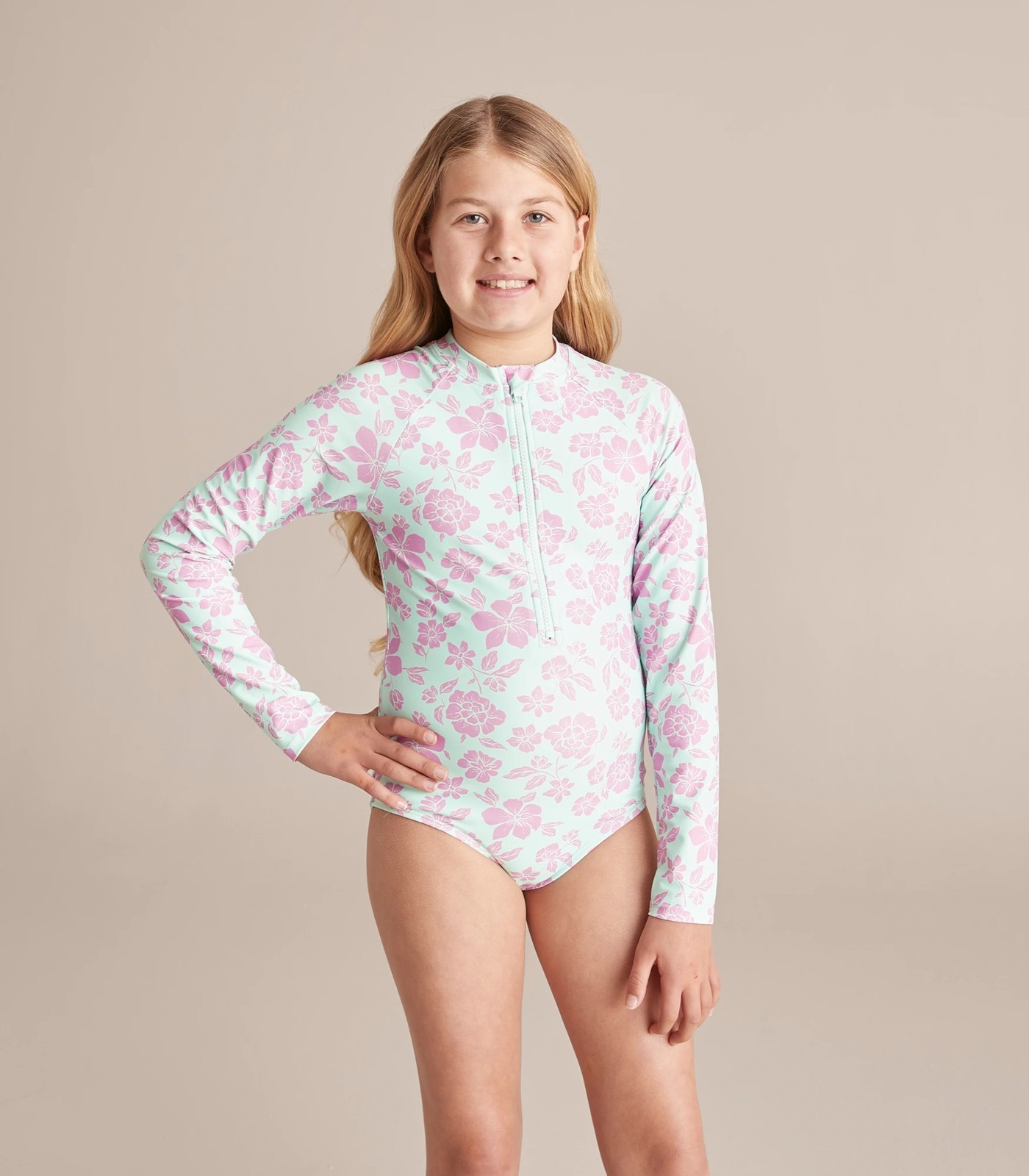 Featuring long raglan sleeves for full range of movement in the water and with excellent UPF 50+ sun protection come the aqua floral Long Sleeve Swim Surfsuit.