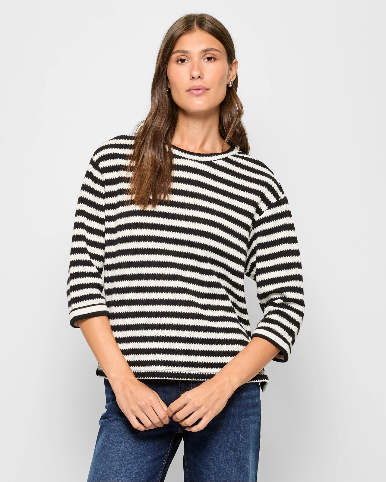 Refresh your wardrobe with this chic long sleeve textured top, designed for both style and comfort. Made from a blend of polyester and cotton, it features an intricate textured knit pattern that adds sophistication. The versatile black and white stripe makes it an ideal match for various outfits. With a crew neckline and long rolled cuff sleeves, this top offers a relaxed yet elegant look. The straight hemline and side seam splits ensure easy movement, making it perfect for any occasion. Add this essential piece to your collection today.