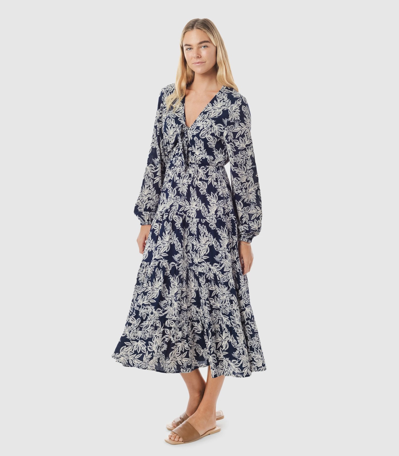 Imagine stepping out in style with our elegant Piping Hot Midi Dress. The lightweight and airy viscose fabric keeps you comfortable all day, while the navy blue and white floral design adds a touch of sophistication to your look. The tie front detail enhances your waistline, giving you a chic and trendy vibe. With its V-neckline and stylish A-line skirt, you'll feel confident and fabulous on any occasion. Don't miss out on adding a touch of glamour to your wardrobe with our stunning Midi Dress today!