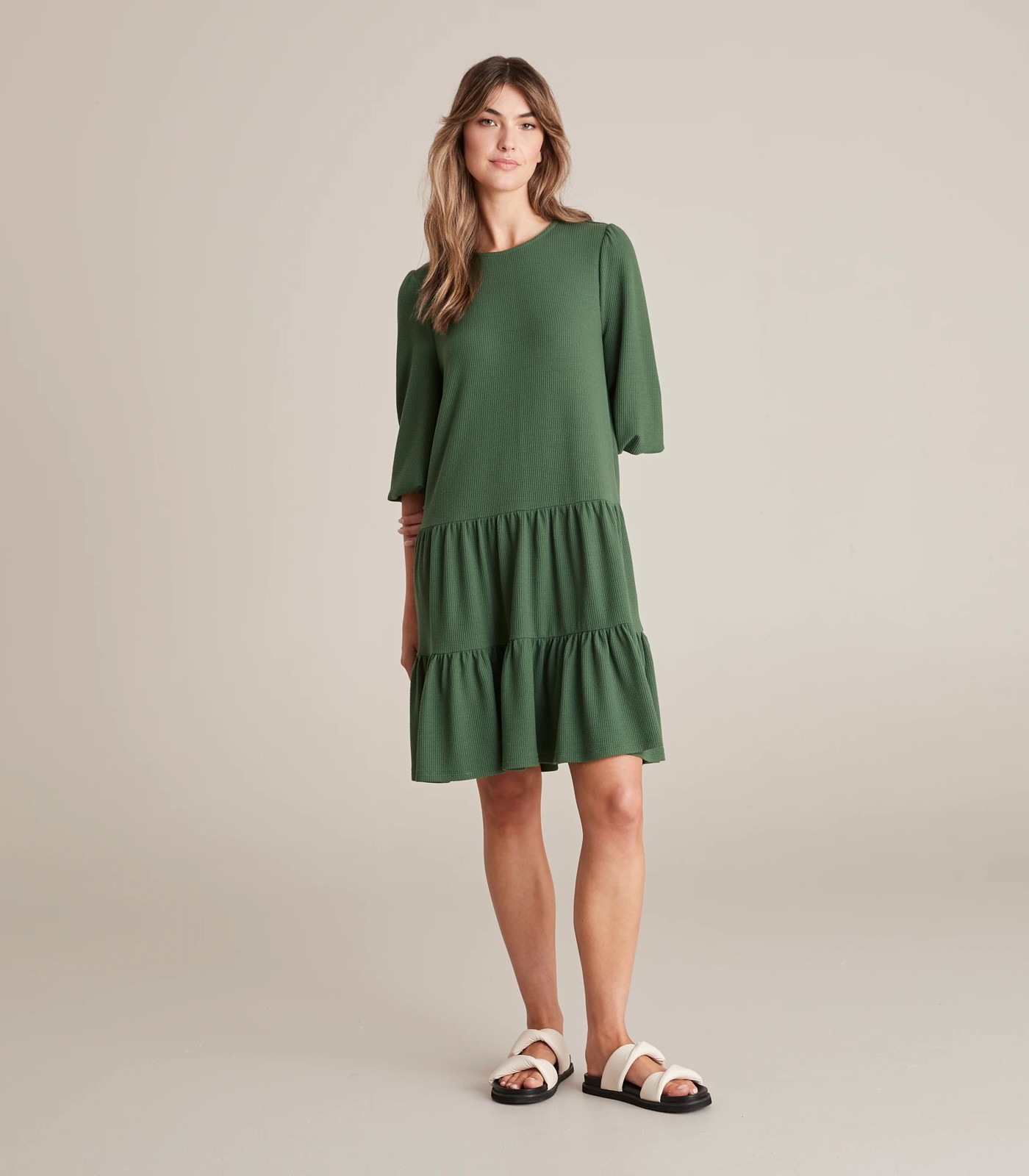 A cute everyday dress, the long sleeve tiered mini dress will look perfect with your favourite pair of shoes throughout the seasons. It features a crew neckline, an all over ribbed design, tiered bottom panels and a mini length.