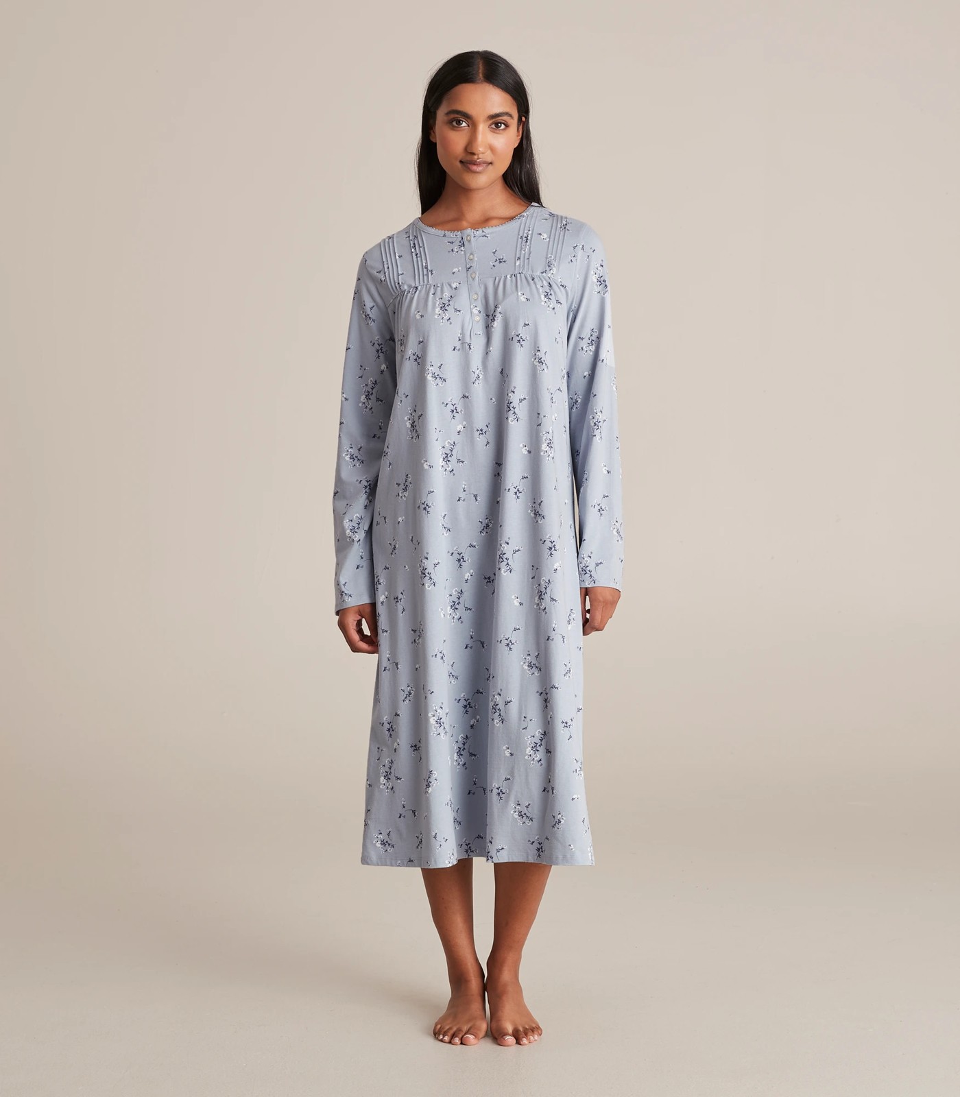 For great coverage at night and a comfortable and breathable fabrication, the traditional pintuck nightie features a breathable cotton material, a longline design, long sleeves and a button down front detail.