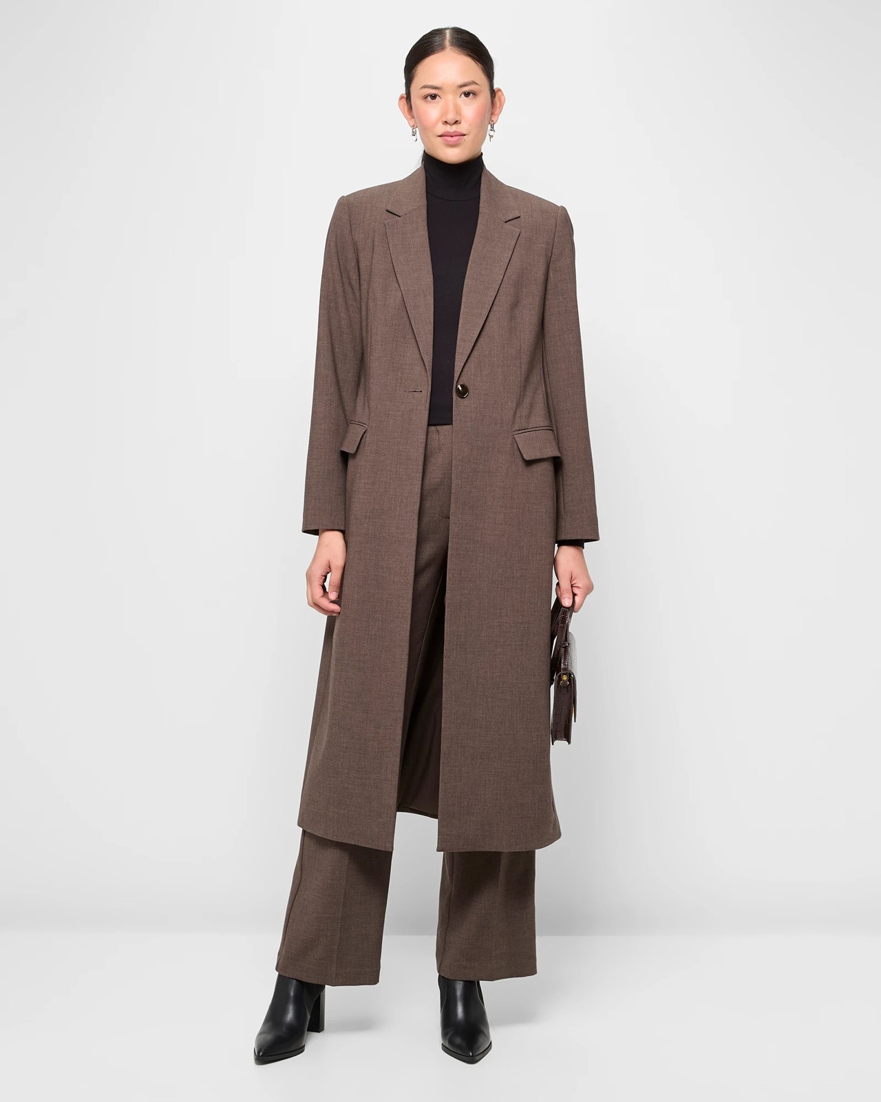 Step out in style with this elegant Longline Blazer Coat. Made from a refined polyester and viscose blend, this coat offers a hint of stretch for all-day comfort. The tailored fit and coffee melange shade make it a sophisticated choice for any occasion. Designed with a round collared neckline, front lapels, and button closure, it exudes a timeless appeal. The long sleeves and straight hem provide a polished finish, while the inner lining and back centre split ensure ease of movement. This chic addition is perfect for that important meeting or an evening out.
