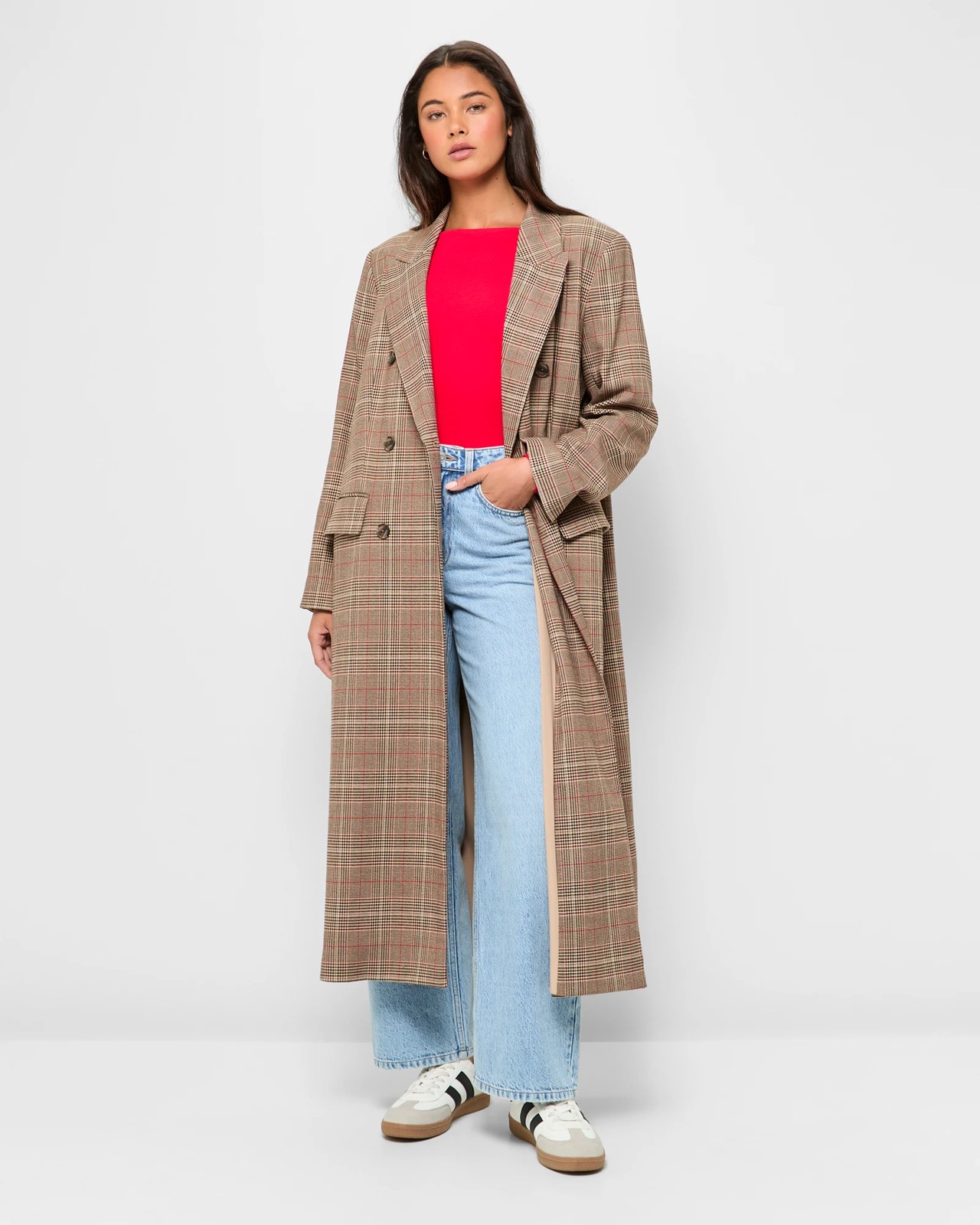 Step up your style game with this Longline Check Blazer Coat from Lily Loves. This stylish piece features a blend of polyester and viscose, complemented by stretch elastane for ultimate comfort. Lined on the inside for a smooth fit, it’s designed with a refined brown and red check pattern. The blazer boasts a round collar with front lapels, lightly padded shoulders, and long sleeves. It’s double-breasted with a secure double button closure, and includes convenient front pockets. The longline silhouette and straight hemline are finished with a back slit for added mobility.