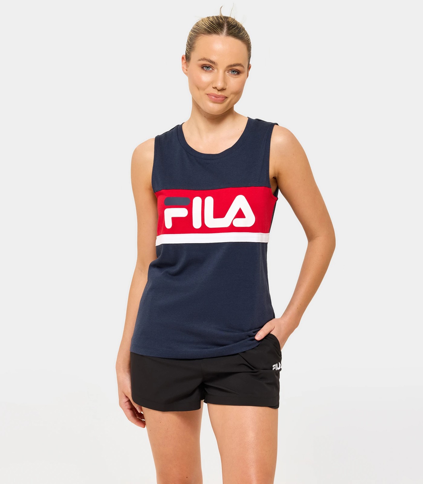Take on any challenge ahead when you rep the Women's Luisa spliced tank from Fila. Designed for both fashion and functionality, this tank offers lightweight fabric that keeps you cool and comfortable all day long. Featuring a contrast splice to chest with a Fila print.