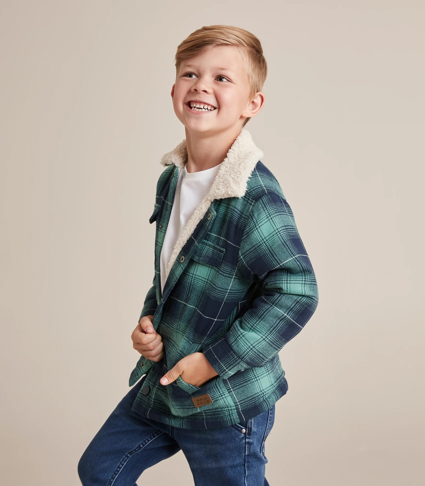 A great addition for his winter wardrobe comes the flannelette check Lumber Jacket, featuring sherpa fleece lining and collar and a press stud closure down front.