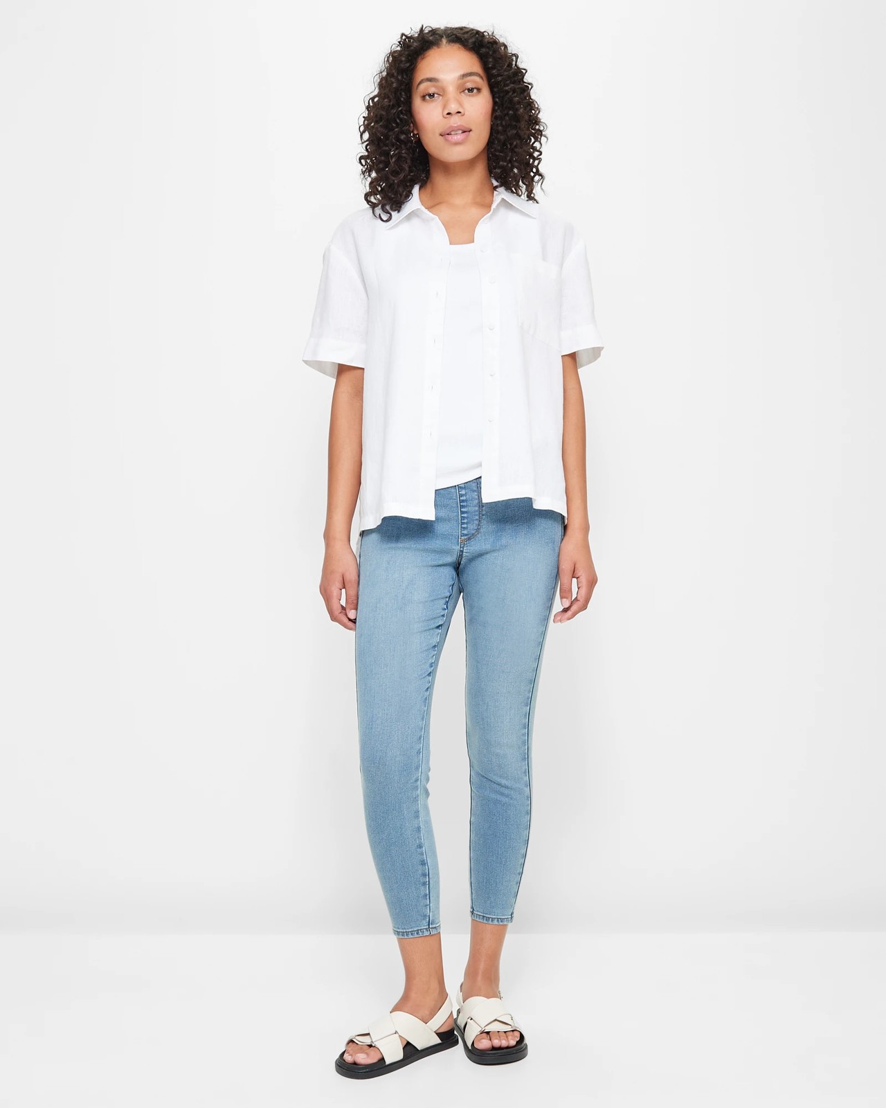 Indulge in the perfect blend of style and comfort with our Lydia denim leggings. Crafted from a soft cotton/polyester mix, these leggings offer exceptional stretch for all-day wear. The high-rise design coupled with a skinny cut leg and crop length provides a flattering silhouette. Featuring a vibrant daybreak blue hue, wide flat elastic waistband, and functional back pocket, these jeggings are a wardrobe essential. Upgrade your casual chic look effortlessly with our Lydia denim leggings!