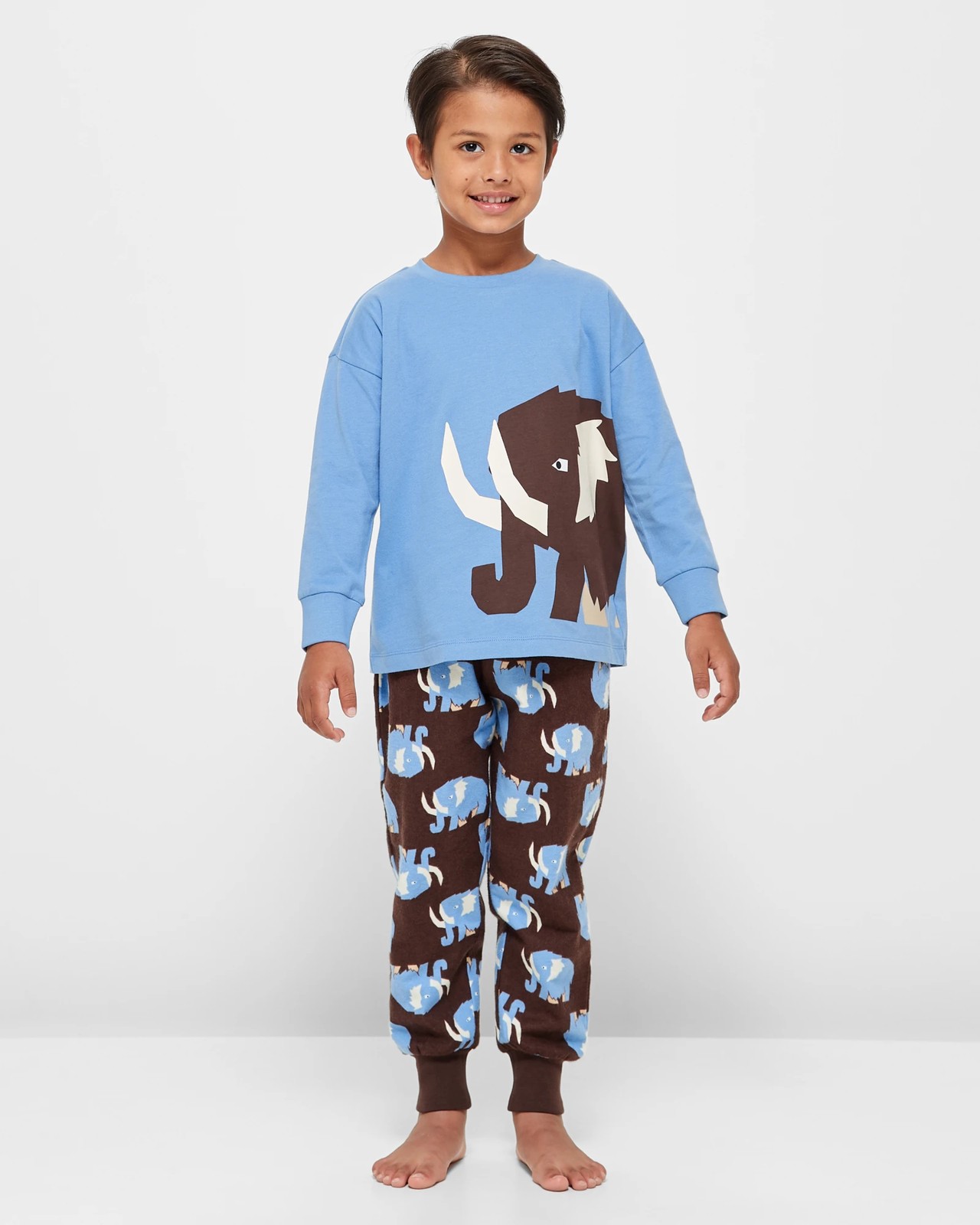 Indulge in the comfort of our Mammoth Cotton Pyjama Set. Let your little one embrace a good night's sleep in this delightful 2-piece set featuring a striking large mammoth print on the front. The long-sleeved top comes with ribbed cuffs for extra warmth, while the brown all-over print flannelette pants have an elastic waistband for a perfect fit. Crafted from soft cotton, this set ensures a cosy and snug feel. Upgrade your child's bedtime routine with this adorable sleepwear, perfect for restful nights and lazy mornings.