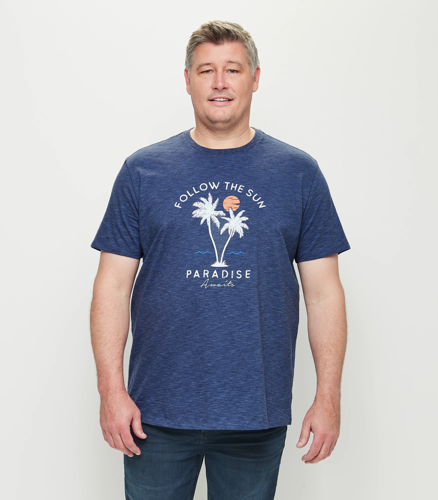 Bring a relaxed, effortless style to your wardrobe with the Man Plus Palm Print T-Shirt. Crafted from lightweight and breathable cotton, this navy blue tee is perfect for warm days in the sun. The short sleeves and crew neckline provide a classic silhouette, while the straight hem adds a touch of modernity. The playful printed design makes it an easy way to add some fun to your look. The regular fit ensures all-day comfort you won't want to be without.