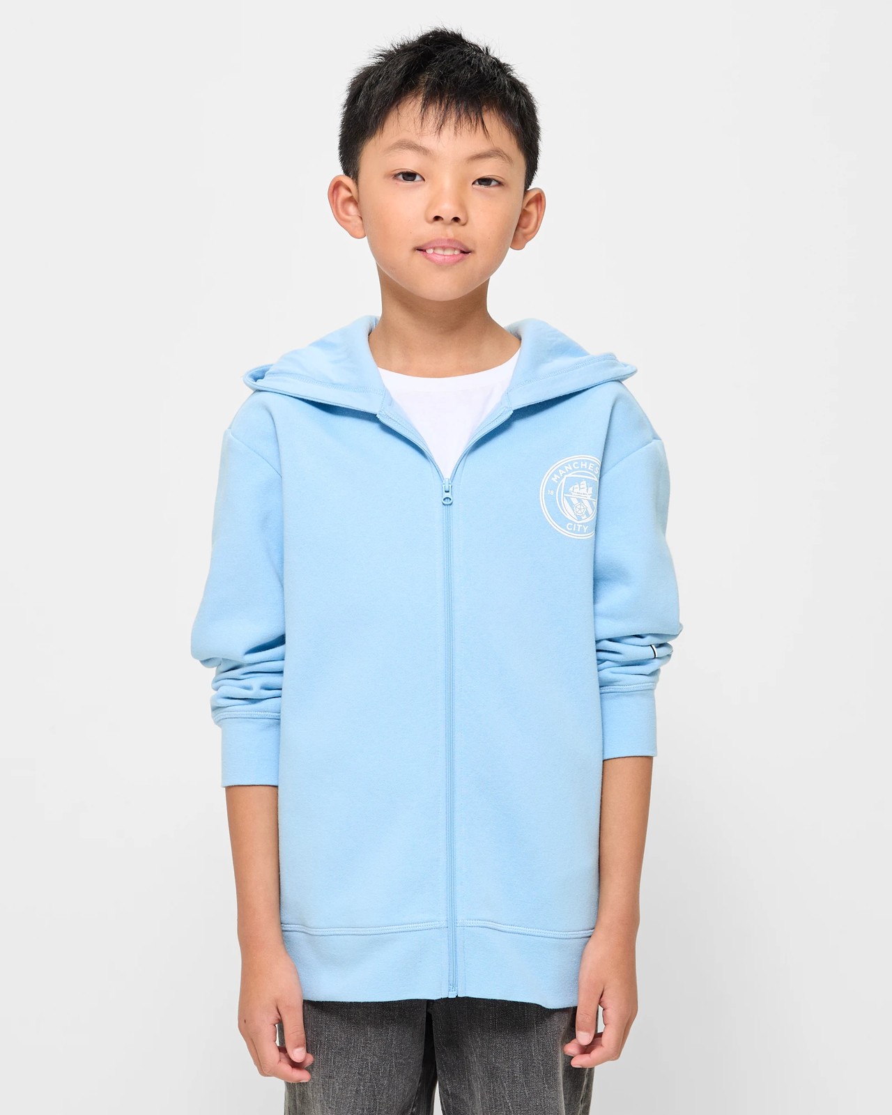 Stay warm and stylish with our Manchester City Zip Hoodie. Perfect for young fans, this hoodie features a comfortable cotton-polyester blend that ensures a cosy fit. Adorned with the Manchester City Football Club print on the chest, it's a must-have for every supporter. The zip front makes it easy to wear, and the fleece lining provides extra warmth on cooler days. Whether heading to the match or just out with friends, this hoodie is your go-to for displaying team pride.