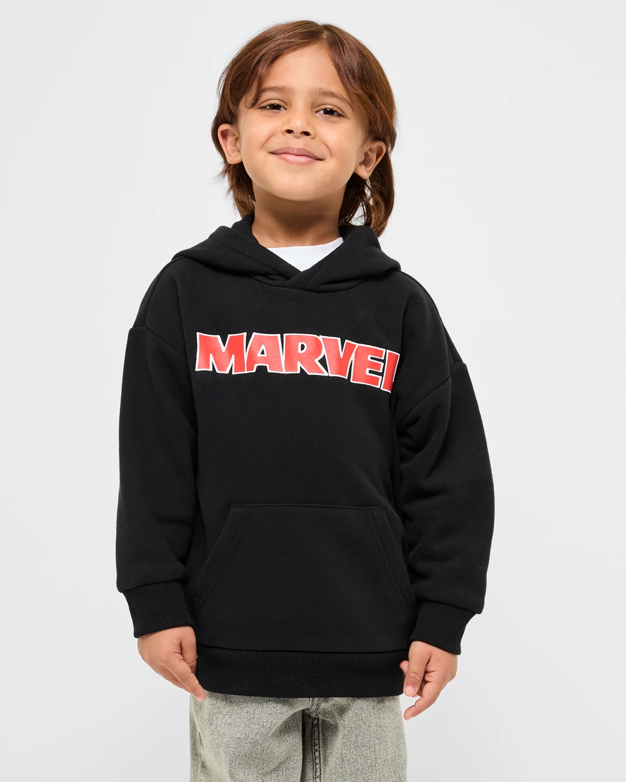 Step into the world of superheroes with this boys' Marvel hoodie. Made from a comfy cotton-poly blend, this hoodie ensures both warmth and lasting wear. It comes in a classic black shade with a striking Marvel design on the chest and a large, bold graphic on the back that will surely stand out. The design includes long sleeves with ribbed cuffs and a straight ribbed hem, adding to the snug fit. A front kangaroo pocket offers practical storage and a place to keep hands warm. Perfect for school, weekends, or casual outings, this hoodie is a must-have for any young Marvel fan. Grab it and let your little hero's adventures begin!
