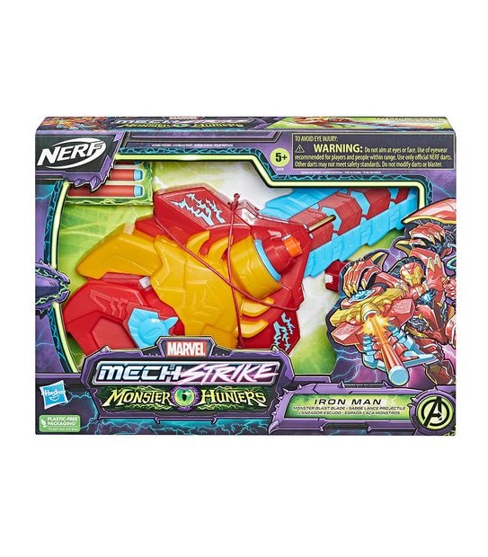Kids ages 5 and up can imagine suiting up for monster-sized battles alongside the first Avenger with the Iron Man Monster Blast Blade, inspired by the Marvel Universe! Featuring monster-ized Marvel Universe-inspired design and deco, kids can pull back on the monster eye icon to activate the pop-out blade. Pretend to take aim at the target and press the button on the handle to fire a NERF dart! Boys and girls will love pretending to gear up to battle enhanced villains looking to conquer the world!
