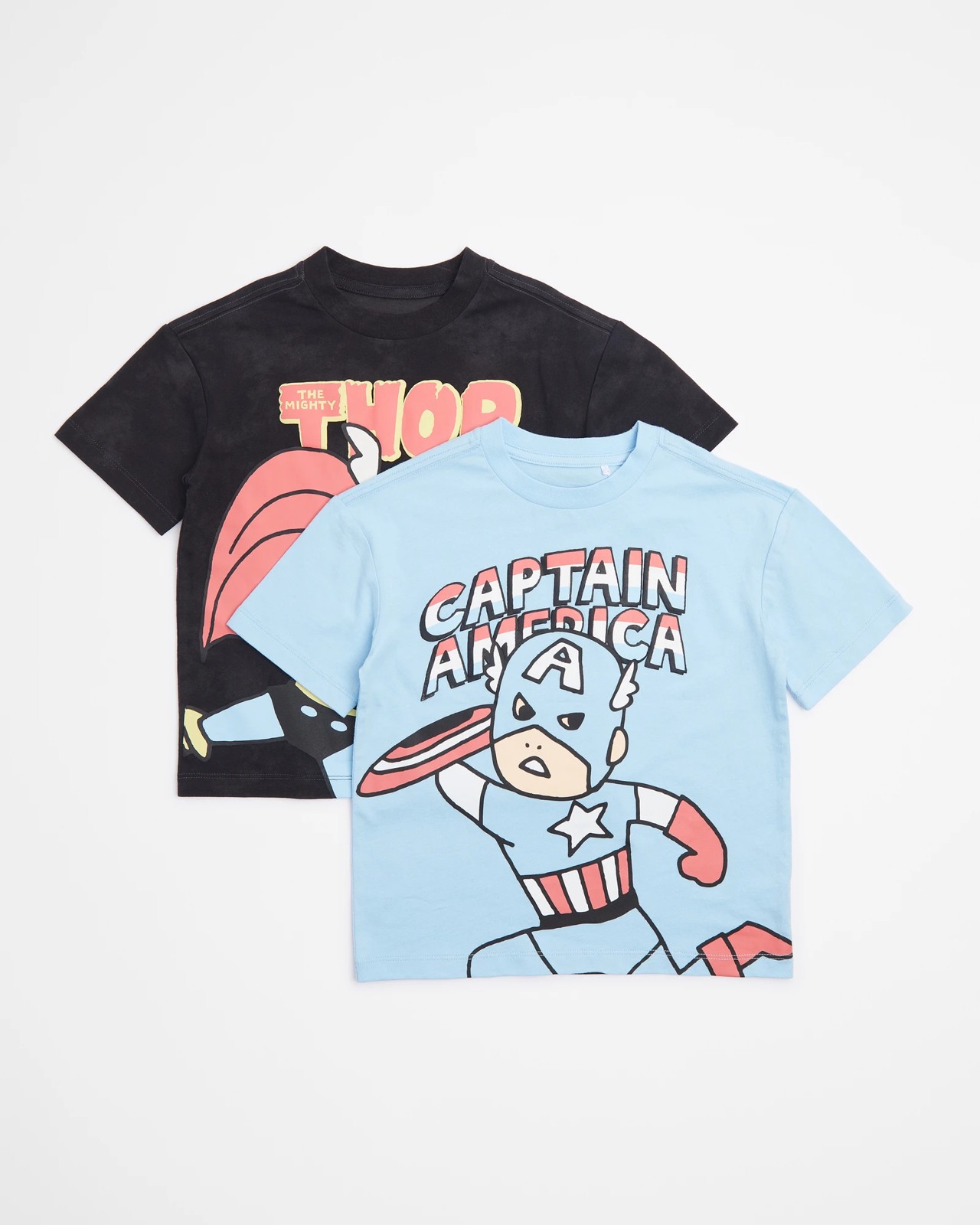 Get ready for a battle of the superheroes with this 2 Pack Marvel Print T-shirts. Crafted from a cotton-rich fabric, these T-shirts feature a regular fit and ribbed crew neck for comfort. The pack includes one black Thor T-shirt with a large print to the chest, and one light blue Captain America T-shirt with a large print to the chest. Both styles offer short sleeves and straight hemline for an easy fit.