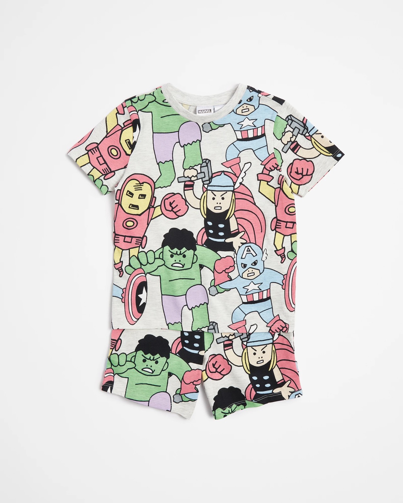 This Marvel Pyjama Set is perfect for any fan of the iconic Marvel characters! The two-piece set features a grey marle all-over Marvel character print on a cotton viscose fabric. It has a regular fit with a ribbed crew neck, short sleeves and straight hem. The matching shorts also feature an elastic waistband for added comfort. This pyjama set is sure to be a hit!