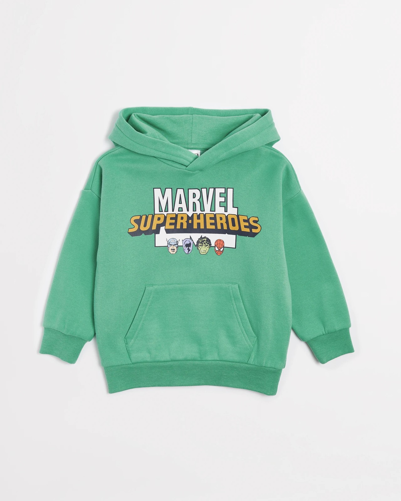 Wrap yourself in comfort and style with the Marvel Super-Hero Hoodie. Constructed from a cotton-rich fabric, this regular-fit, green hoodie is designed to keep you cosy with its fleece lining. The standout feature is the bold Marvel superhero print on both front and back, which adds visual appeal. Equipped with long sleeves and ribbed cuffs, it offers snug warmth during cooler days. The front kanga pocket is perfect for keeping your hands warm or storing small essentials. Ready to take on the day like a true hero? This hoodie is your perfect companion!