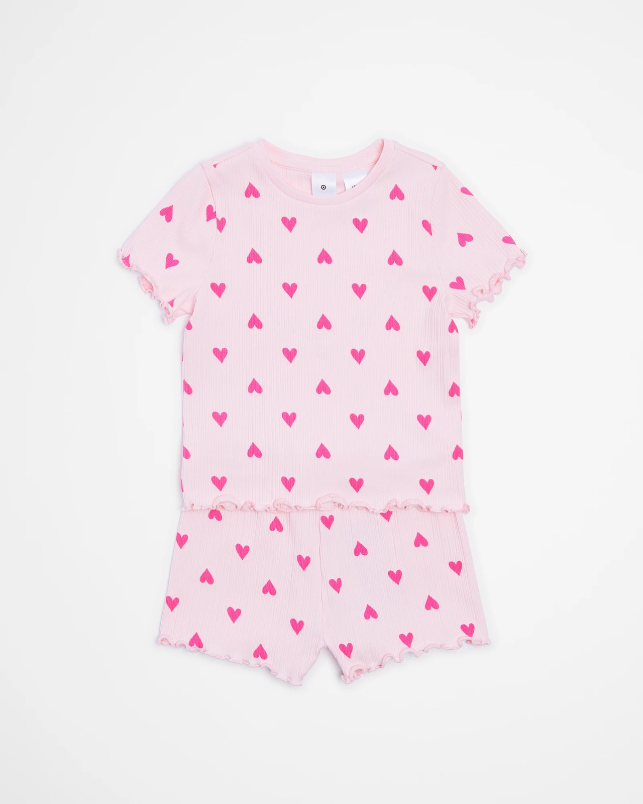 This two-piece pyjama set from Matching Sibling Heart is perfect for sweet dreams. Featuring a light pink cotton rib fabric with an all over heart print, it has a regular fit and includes a ribbed crew neck top with short sleeves and lettuce cuffs, plus lettuce hem detailing. The matching shorts have an elastic waistband and lettuce hem. Perfect for siblings, it’s available as a matching set - sold separately.
