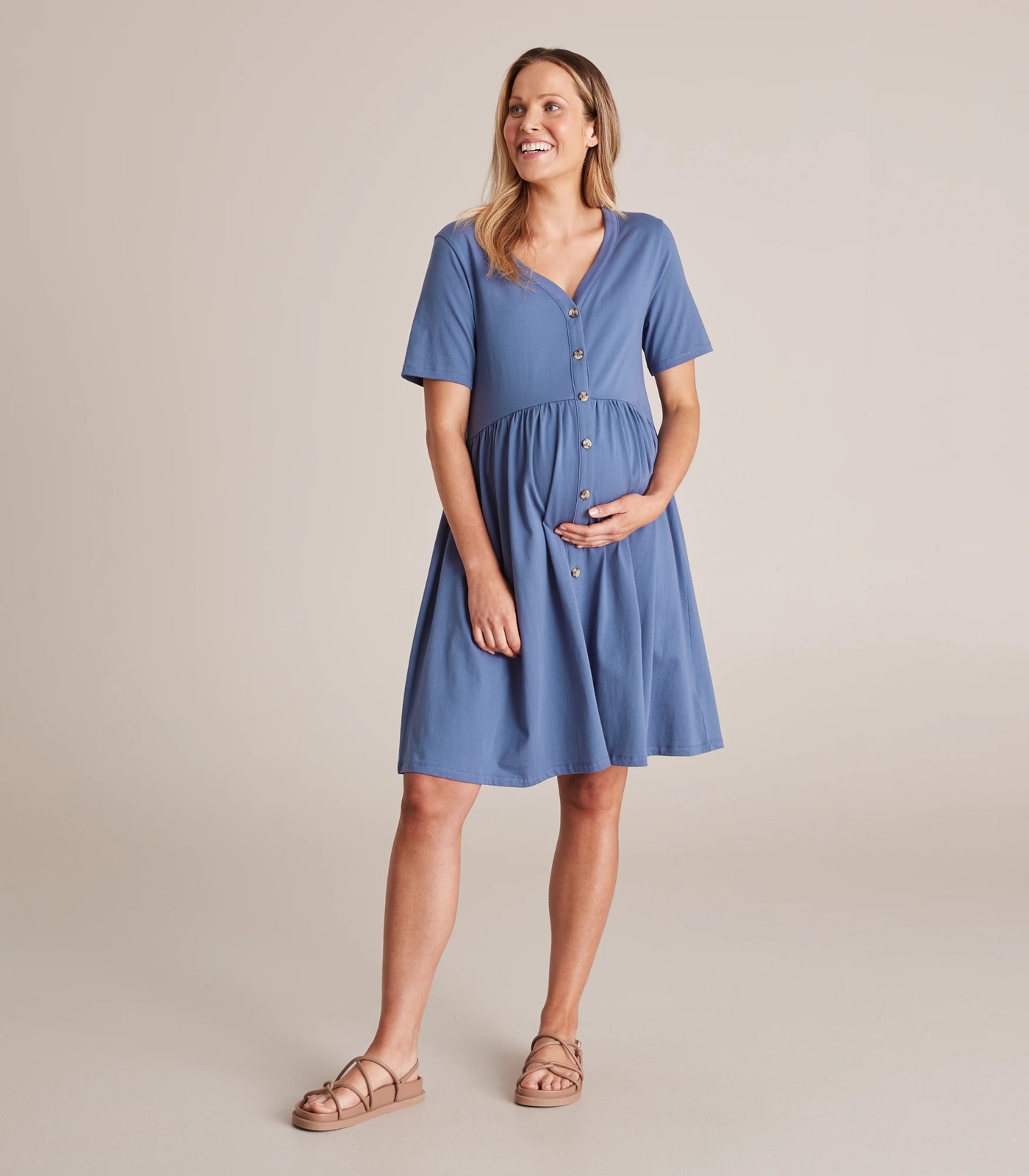 Be completely comfortable pre and post baby in our Maternity button through dress. Perfect for all day wear, it features a v-neckline, a button through front for easy nursing and pull on and an all over lightweight jersey design.