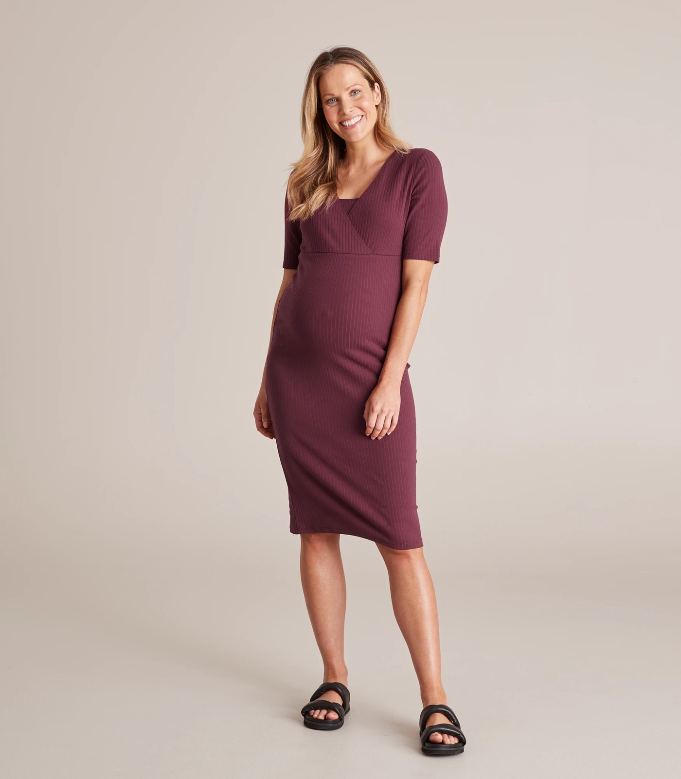 A classy dress for an ever-changing body, the maternity cross over ribbed dress is made from a lightweight cotton rich fabric with stretch for comfort, a cross over chest with modesty flap underneath for coverage, short sleeves and an all over ribbed design.