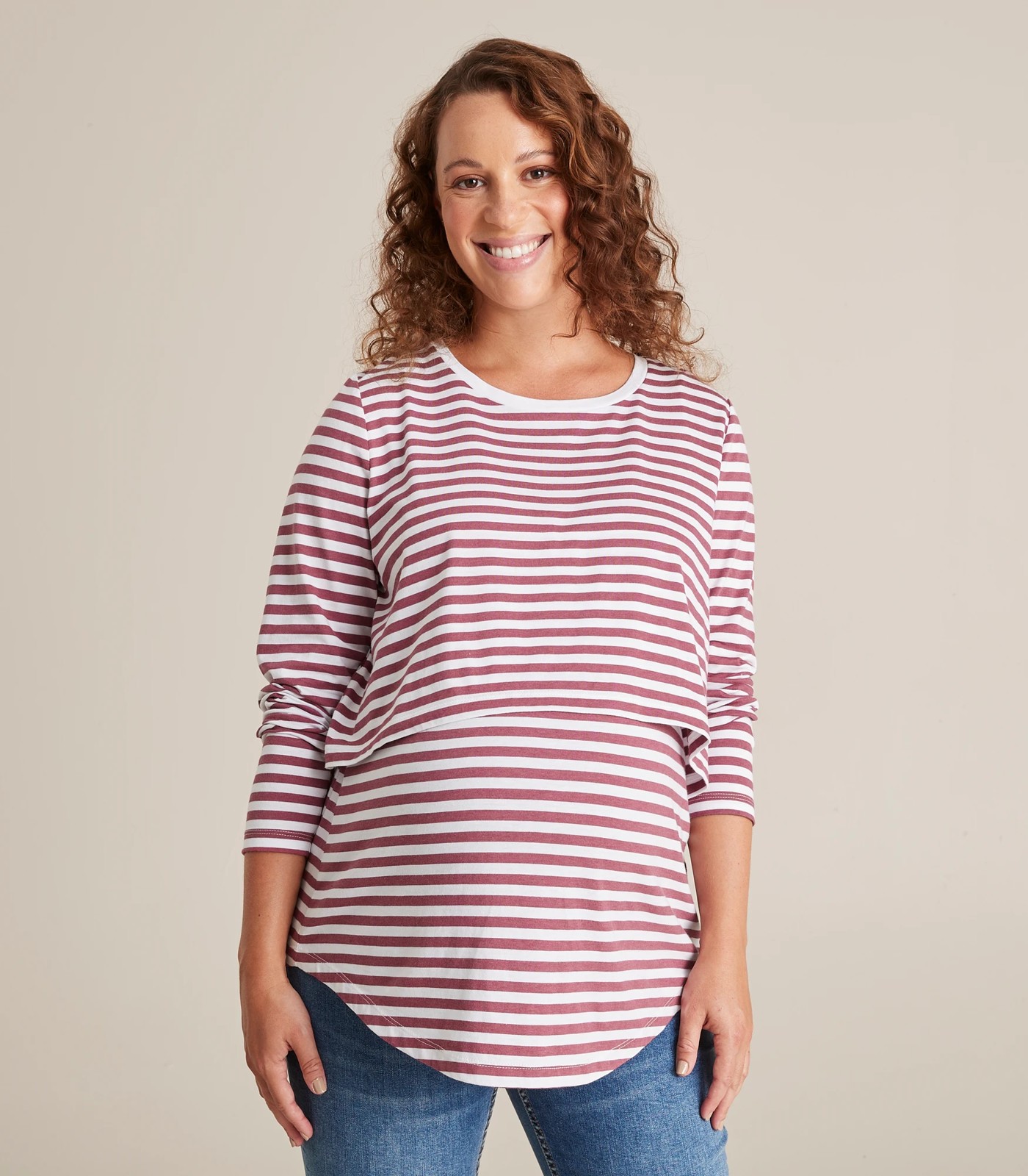 The long sleeve maternity nursing overlay top is great for pre and post baby as it is designed to fit over your growing bump and has discreet nursing access. It also has long sleeves and an all over striped print.