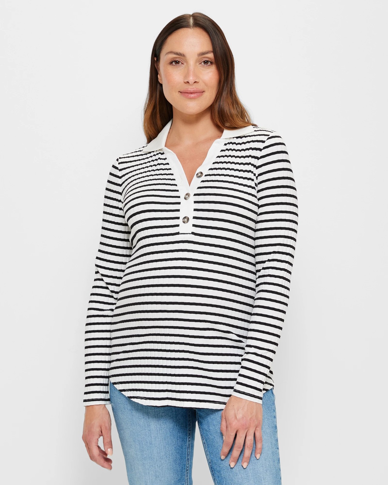 This Maternity Ribbed Polo Top is the perfect addition to any expecting mother's wardrobe. It is made from a comfortable cotton/polyester blend that stretches to fit the growing belly. The all over ribbed design adds a stylish touch to this top, while the regular fit ensures a flattering silhouette. The round collared neckline with a front v-drop and button down front provide easy access for nursing. With long sleeves and a curved hemline, this top is versatile and can be worn throughout the year. Stay comfortable and stylish during your pregnancy with this Maternity Ribbed Polo Top.