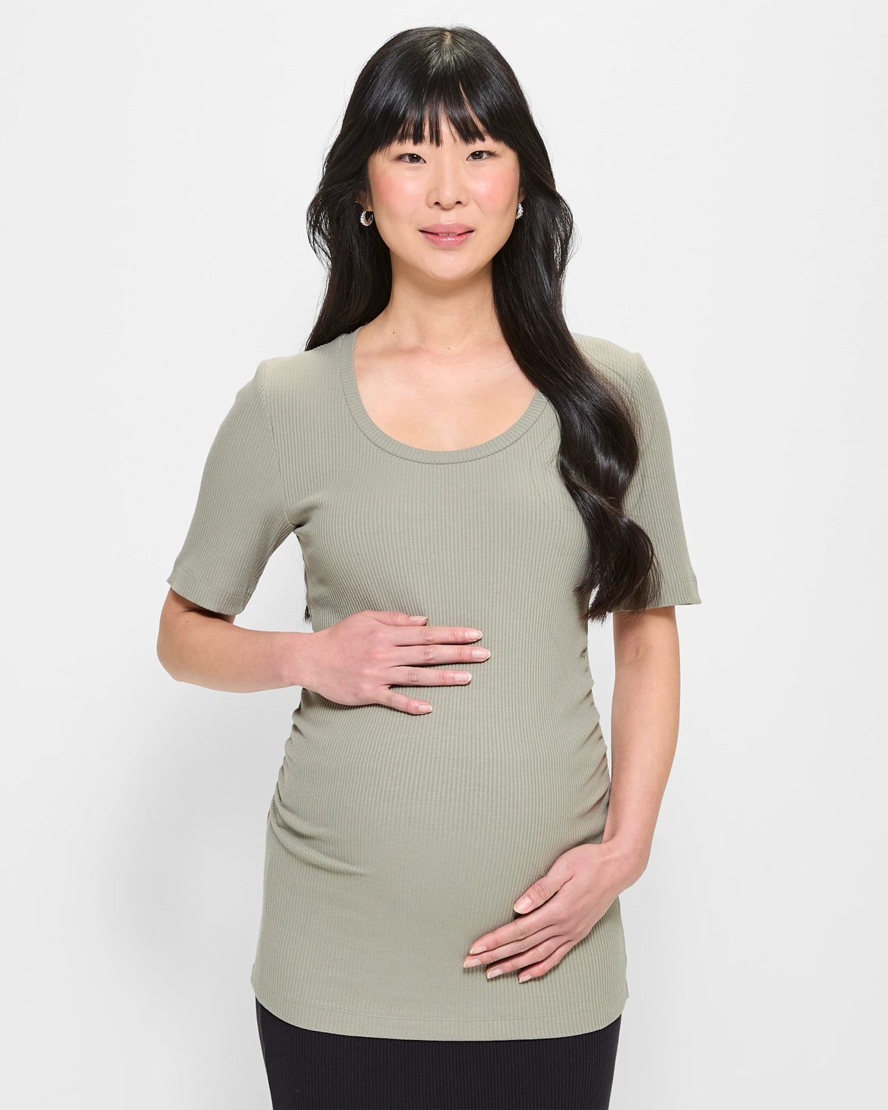 Enjoy the perfect mix of comfort and style with our Maternity Ribbed Scoop Neck T-Shirt. Made from a soft cotton and polyester blend with stretch elastane for added comfort, this T-shirt adapts to your shape with ease. The ribbed design and ruching down the sides highlight your growing baby bump beautifully. Featuring a slim fit, scoop neckline, and long length, this T-shirt is perfect for every stage of your pregnancy and beyond. Make it a staple in your wardrobe and feel exceptional every day.