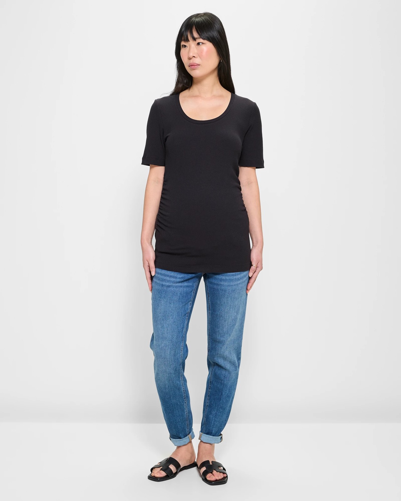 Enjoy the perfect mix of comfort and style with our Maternity Ribbed Scoop Neck T-Shirt. Made from a soft cotton and polyester blend with stretch elastane for added comfort, this T-shirt adapts to your shape with ease. The ribbed design and ruching down the sides highlight your growing baby bump beautifully. Featuring a slim fit, scoop neckline, and long length, this T-shirt is perfect for every stage of your pregnancy and beyond. Make it a staple in your wardrobe and feel exceptional every day.