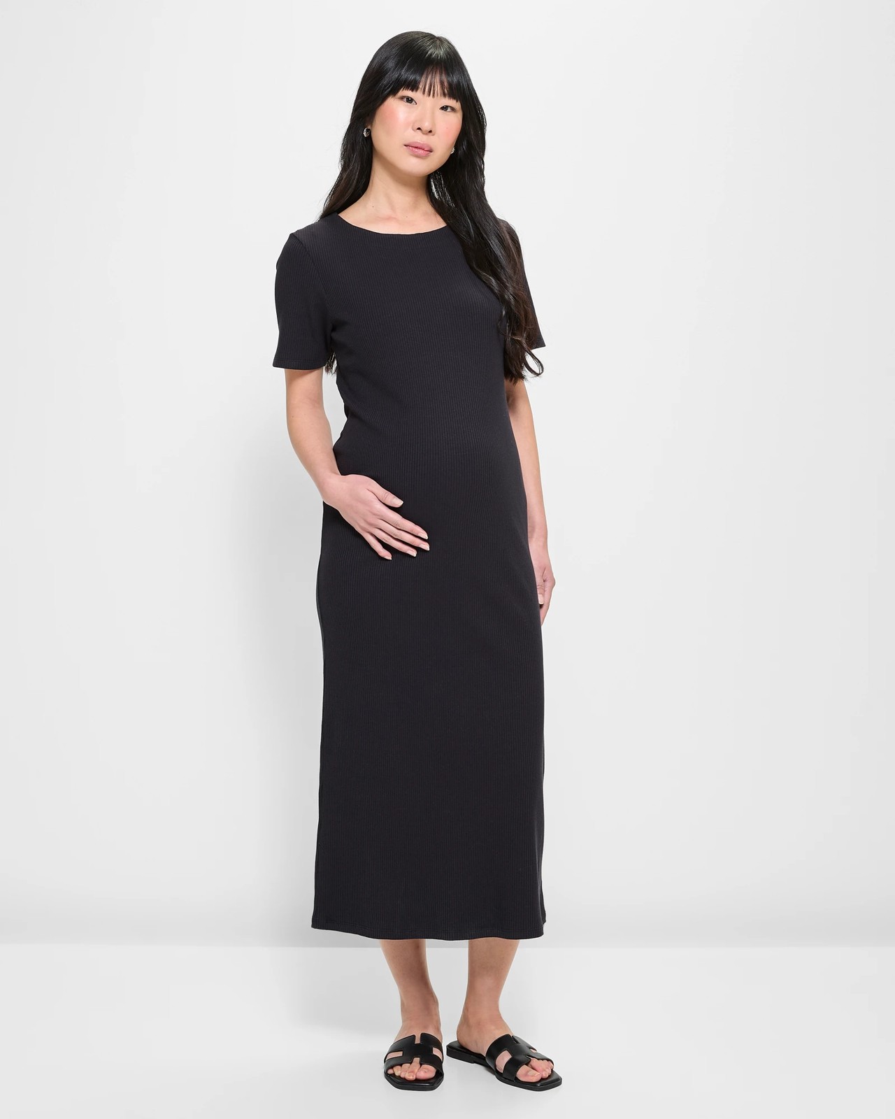 Discover the perfect combination of ease and style with our Maternity Ribbed T-Shirt Dress. Made from a soft cotton and polyester blend with added elastane, this dress provides the ultimate stretch for expecting and new mums. The ribbed design and slim fit enhance your figure, while the boat neckline and short sleeves add a timeless touch. Ideal for various occasions, this black maxi dress will become your staple both before and after pregnancy. Don't miss out on this must-have addition to your wardrobe!