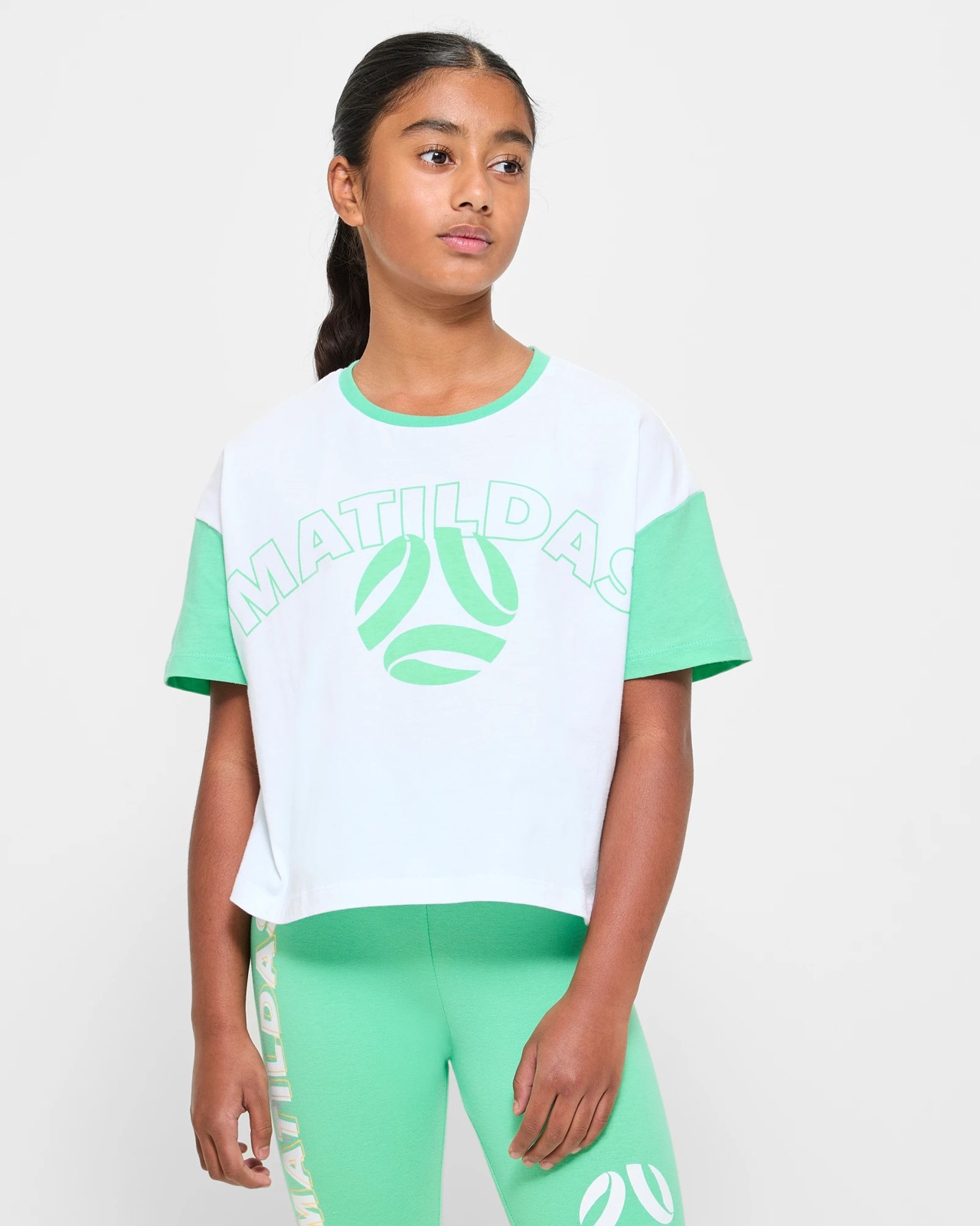 Discover the comfort and style of the Matildas Boxy T-shirt, perfect for everyday wear. This girls' top pairs a classic crew neck with a relaxed boxy fit, ensuring it looks good and feels even better. The contrasting short sleeves add a playful touch, while the bold Matildas print on the front showcases her sporty spirit. The straight hem with side splits provides extra movement, making it an ideal choice for both playtime and casual outings. Add this versatile tee to her wardrobe today and make a stylish statement wherever she goes!