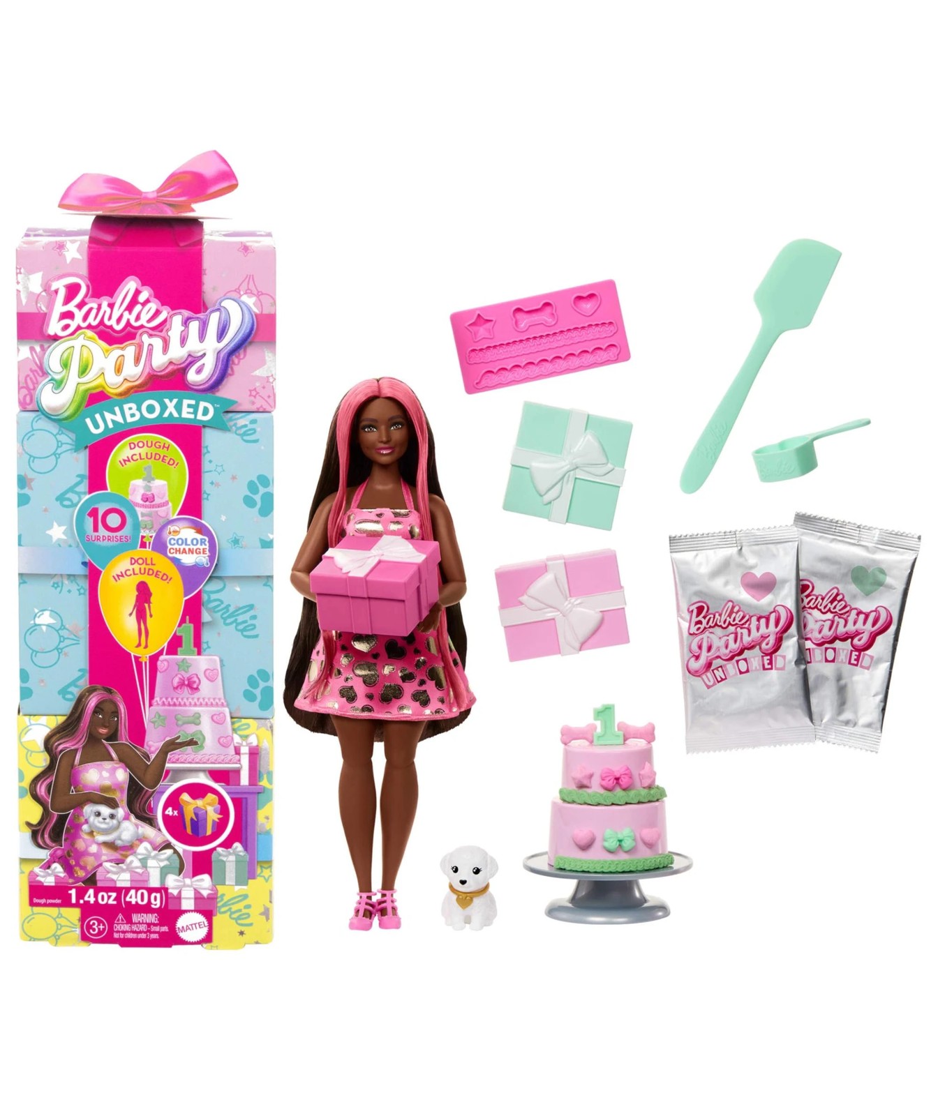 With 10 surprises in one package, Barbie Party Unboxed dolls deliver a unique unboxing experience with gift box-inspired packaging and pet birthday-themed fun! There are three dolls to collect: Birthday Bows, Shimmerin' Hearts or Party Stars. Which doll will you reveal? Keep 'unwrapping' the presents to find party fashions, an adorable pet with dress-up accessory and cake decorating tools. Young creatives can use the easy mix-and-make dough compound, mold tray and tools to make decorations for the included two-tier birthday cake and throw a pet birthday party. More surprises include colour-change on the doll's face and pet -- simply use icy cold and warm water to transform, change back and repeat again and again! Kids will love discovering the party inside this Barbie Party Unboxed Pet Birthday series and can collect them all to keep the party surprises going! Each doll sold separately, subject to availability. Dolls cannot stand alone. Colours and decorations may vary.