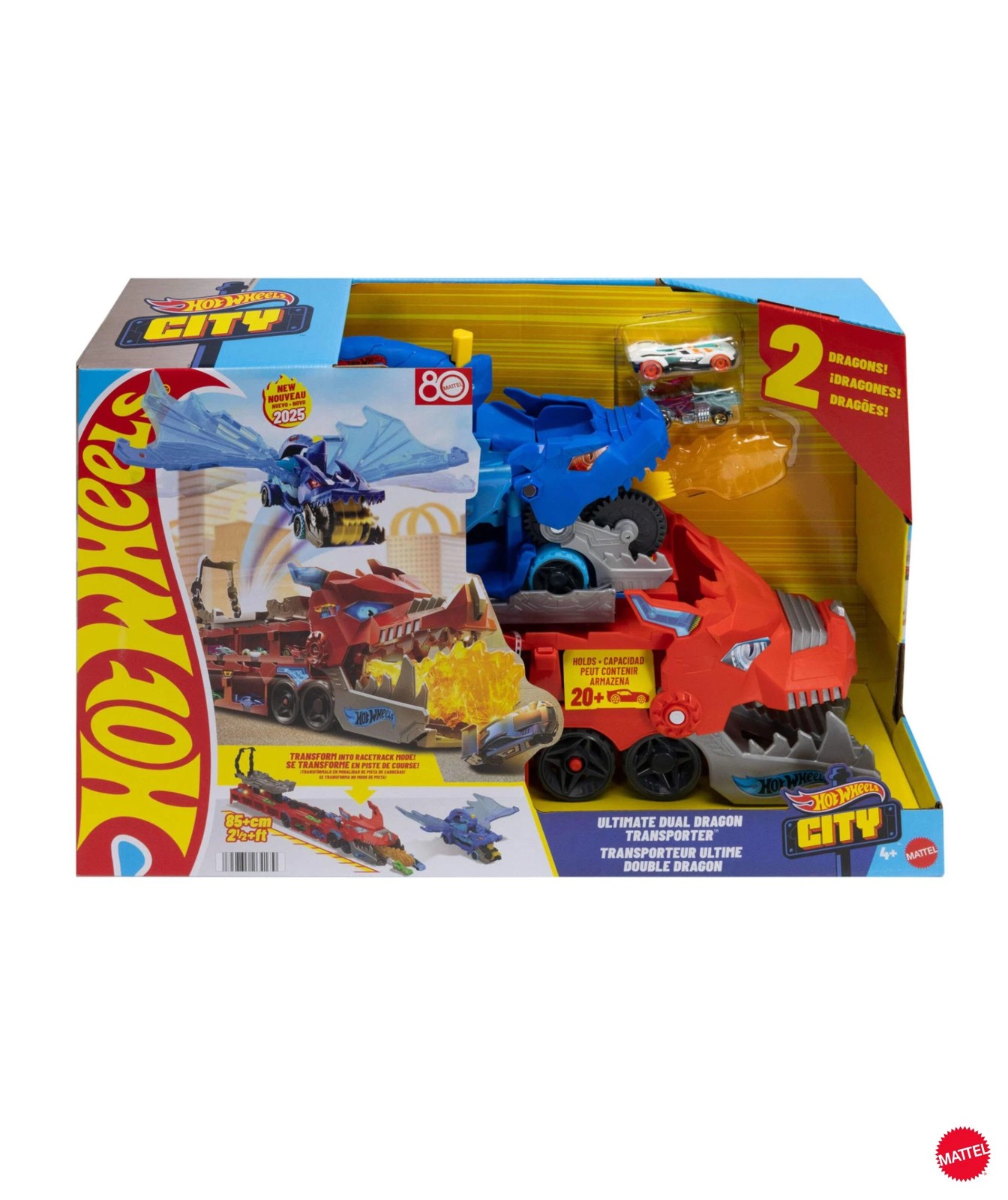 Drive into battle with this large-scale dragon hauler that features an additional detachable dragon that eats toy vehicles! After knocking out cars with the fire-breathing dragon, unlock the smaller dragon and transform it into racetrack! Press the button to make its wings move and emulate a real dragon, then swoop in to make it eat cars. Return to the base and release the vehicles into the launchers where they can take off on side-by-side tracks! The hauler includes two 1:64 scale cars, but kids can store more than 20 vehicles in and on the two dragons. (Additional cars sold separately.) Launch out or connect Hot Wheels track to the front for on-track play. Colours and decorations may vary.