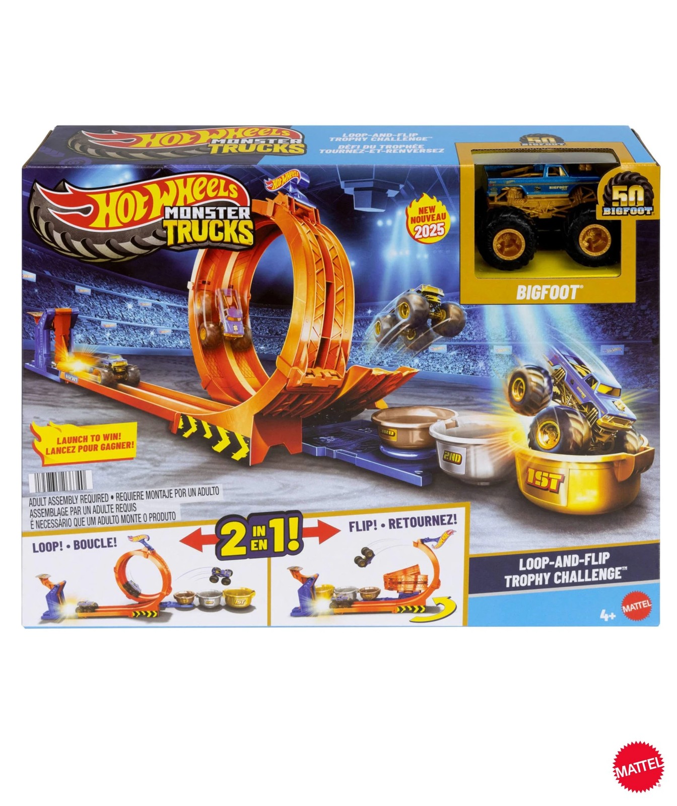 Celebrate the 50th anniversary of Bigfoot with the Hot Wheels Monster Trucks Loop-And-Flip Trophy Challenge playset! It has two possible set-ups: Launch the included 1:64 scale Bigfoot into a full loop before stunting into a trophy cup or reverse the loop so that Bigfoot does a backflip into one of the cups. The trophies vary in size and point value to increase the challenge and provide different ways to play be the first to land in each cup or score the most points. The die-cast Bigfoot has an exclusive deco to commemorate its 50th anniversary. Colours and decorations may vary.