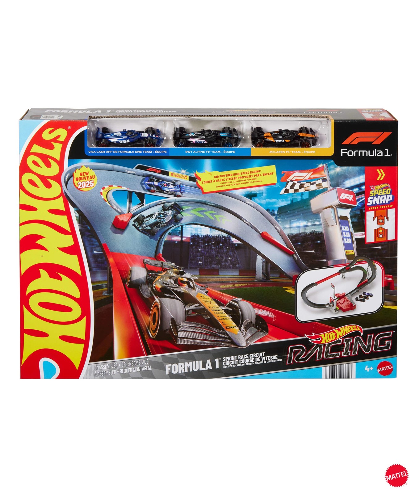 Emulate the thrilling excitement of a Formula 1 race with the Hot Wheels Racing Formula 1 Sprint Race Circuit Track Set. It includes three 1:64 scale die-cast Formula 1 cars with decos matching fan-favourite teams such as McLaren Formula 1 Team, BWT Alpine F1 Team and Visa Cash App RB Formula One Team, and two ways to play. For race mode, load the vehicles into the rev launcher and pump the lever to send them speeding onto the track. Will there be an amazing lead change as the cars get diverted into the overtake lane? In infinite mode, press the pump lever to keep cars racing around the set bypassing the diverters. Track pieces are compatible with Speed Snap Track for expanded racing and stunting. Additional track and sets sold separately. Teams, colours and decorations may vary.