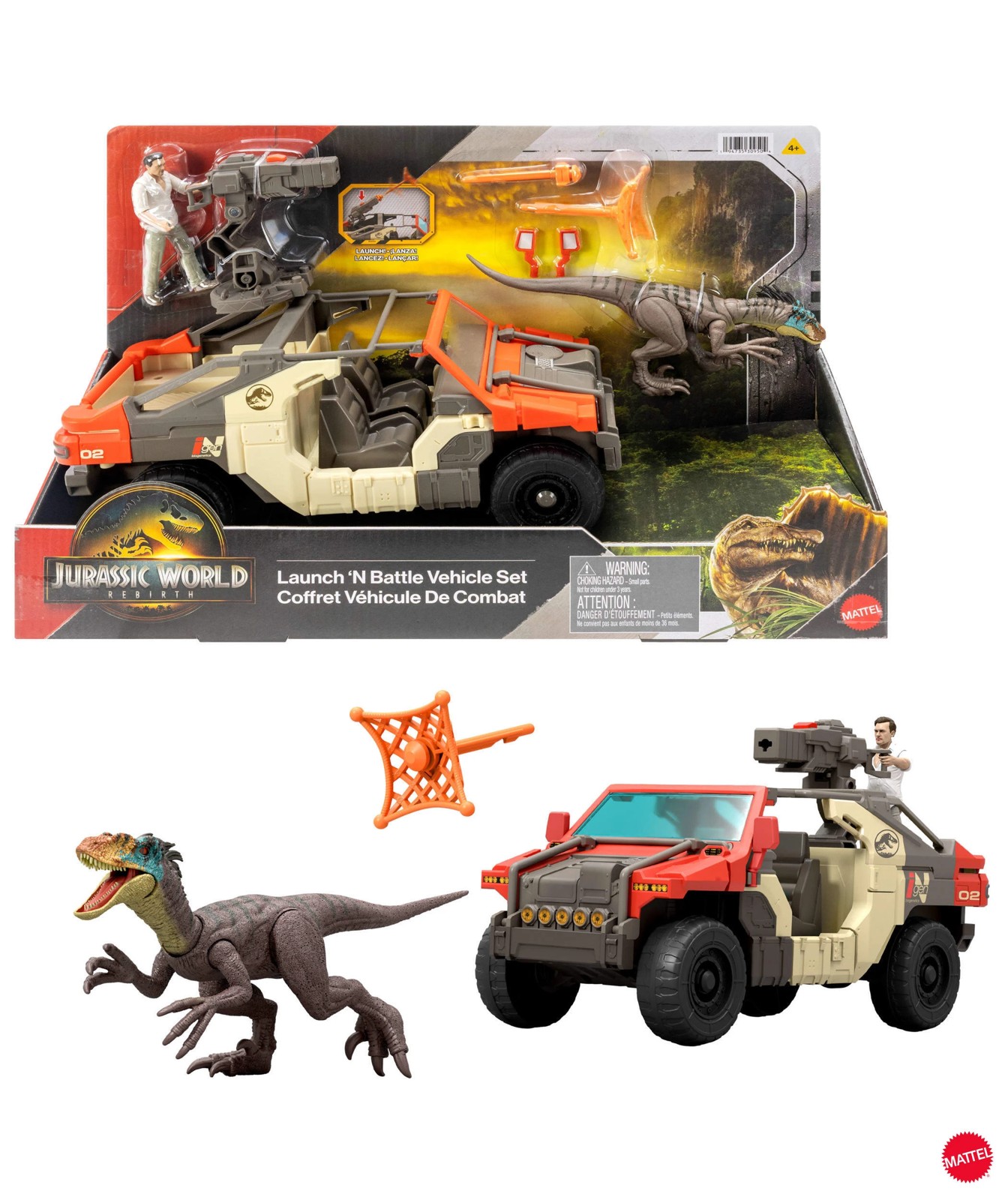 This Jurassic World Rebirth Launch 'N Battle Vehicle, inspired by the excitement of the movie, is ready for adventure with a detachable turret with blaster. It launches either a DNA sample-collecting dart or a net projectile. A Jurassic World Rebirth Velociraptor and Martin Krebs figure are also included for storytelling possibilities. With the 27.2cm long off-road vehicle, 19.1cm long dinosaur and 9.5cm tall Krebs, this story pack is ready for chase and battle action or realistic display. Scan the Tracking Code on the Velociraptor's foot in the free Jurassic World Play App with a compatible smart device (Android or iOS, not included) to unlock a digital version of the dinosaur and play the fiercely fun game to race various vehicles on land, air and sea. Makes a great gift for dinosaur fans ages 4 years and up. Colours and decorations may vary.