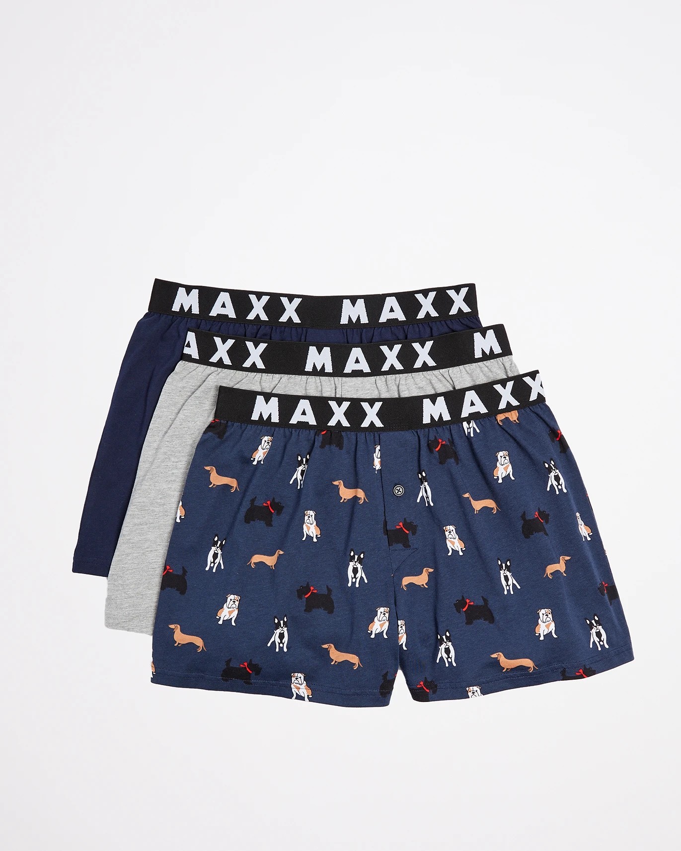 Stay comfortable and stylish with our Maxx 3 Pack Knit Boxers. Crafted from a breathable cotton-rich fabrication, each pair offers stretch for comfort and a regular fit. Including a dog print, grey and navy blue pair of boxers, these boxers offer great value for money. Finished with soft touch elastic waistbands and functional fly front with single button closure, these Maxx 3 Pack Knit Boxers will add a touch of style to your wardrobe.