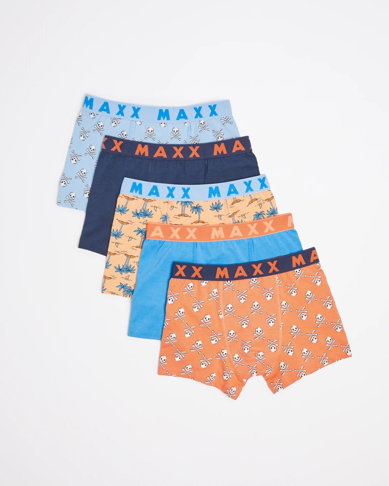 Introducing the 5 Pack Maxx Boys Trunks! Made out of a cotton rich material, these trunks feature a regular fit and Maxx elastic waistband for a comfortable fit. This five pack of trunks also comes with a variety of colours and skull desert prints to choose from. Plus, each pair includes a double layered front pouch for extra support. Get ready to feel secure and stylish in the 5 Pack Maxx Boys Trunks!