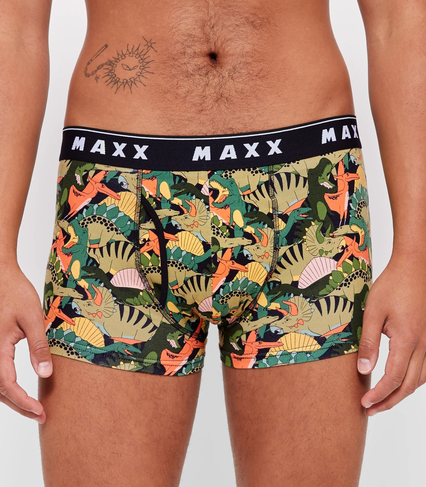Step into comfort with our Maxx Flyfront Trunks featuring fun dinosaur designs. These trunks are made from a cotton-rich blend that offers just the right amount of stretch for a snug, yet flexible fit. Our exclusive Maxx Cool & Dry technology ensures you stay fresh and dry no matter what the day throws at you. The elastic waistband and functional flyfront make for easy wear, while the short length adds a modern touch. Experience the combination of practicality and fun today!