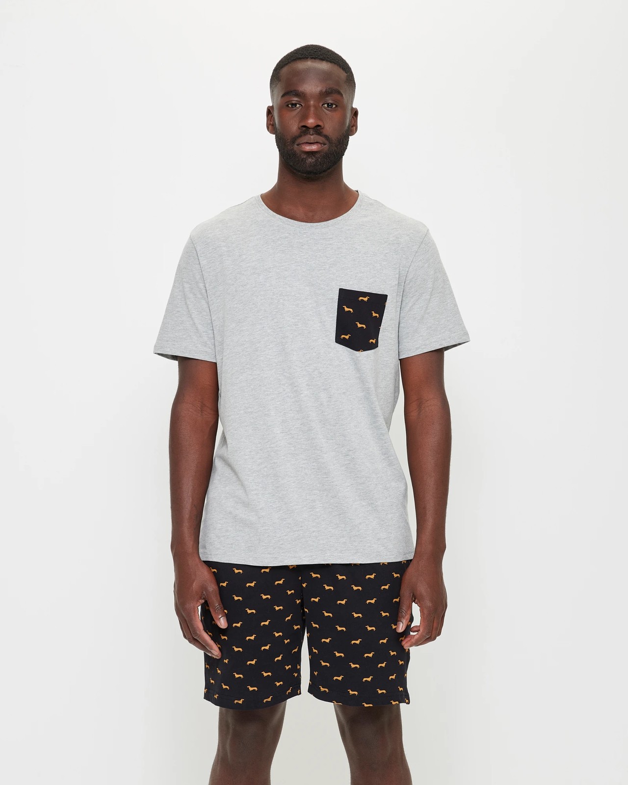 Stay comfy and stylish in our Maxx Jersey Pyjama Set. With a regular fit, this jersey set features a soft cotton/viscose blend for maximum comfort. The grey colour is paired with a black chest pocket and cute dachshund print, making it perfect for relaxing nights in. The short sleeves and straight hem offer easy movement, while the crew neckline adds an extra touch of style. Get ready to lounge in style with our Maxx Jersey Pyjama Set!