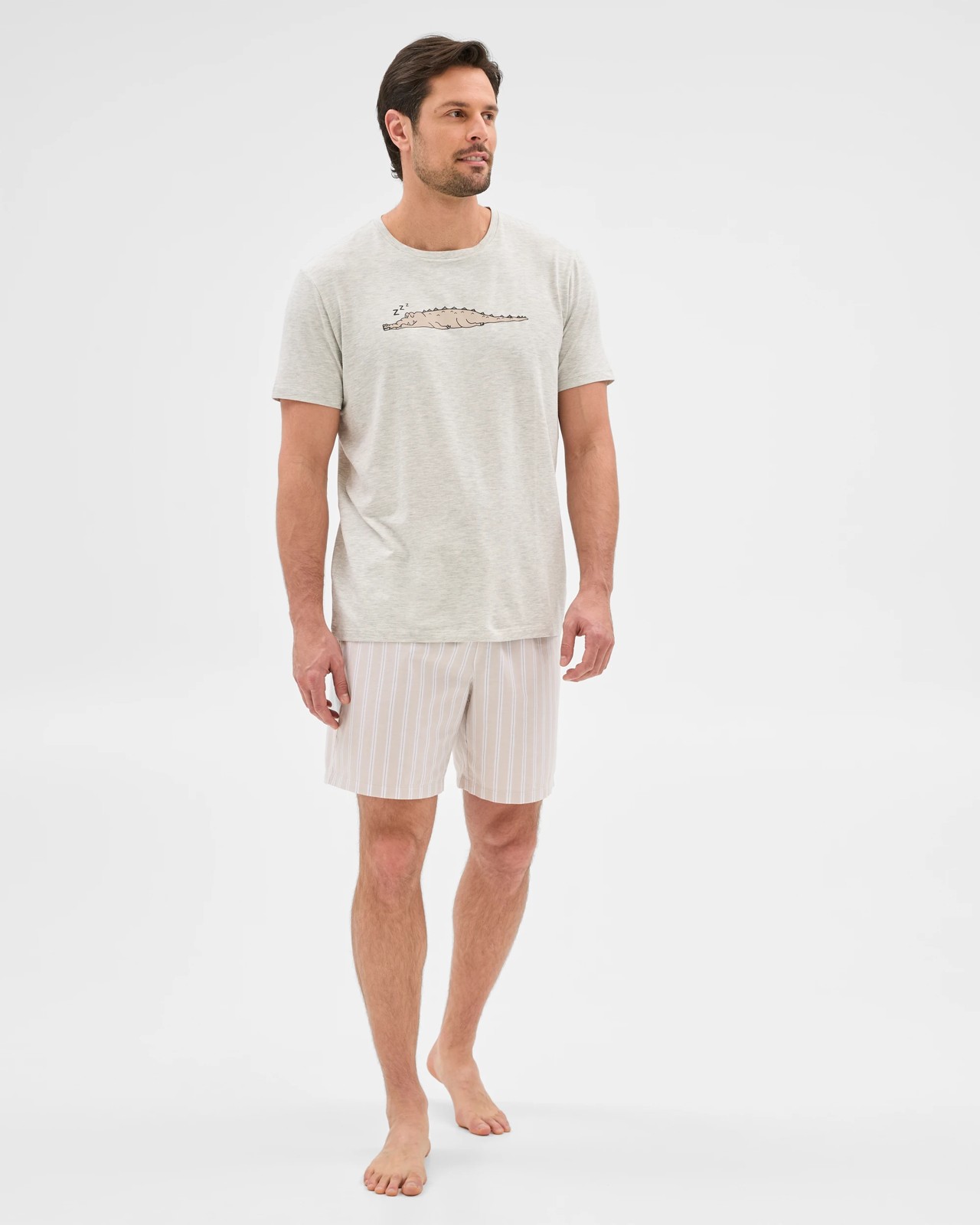 Settle in for a restful sleep with this men's Australian cotton blend pyjama set, designed for your ultimate comfort. The jersey top feels soft and smooth, featuring a fun crocodile print and a ribbed crew neckline for a touch of style. Paired with breathable Oxford stripe shorts, which come with a handy drawstring waistband, this set keeps you cool and comfortable through warmer nights. With its relaxed fit and airy feel, it’s just right for lounging or sleeping. Treat yourself to sleepwear that makes every evening a little more enjoyable—why not try it for yourself?
