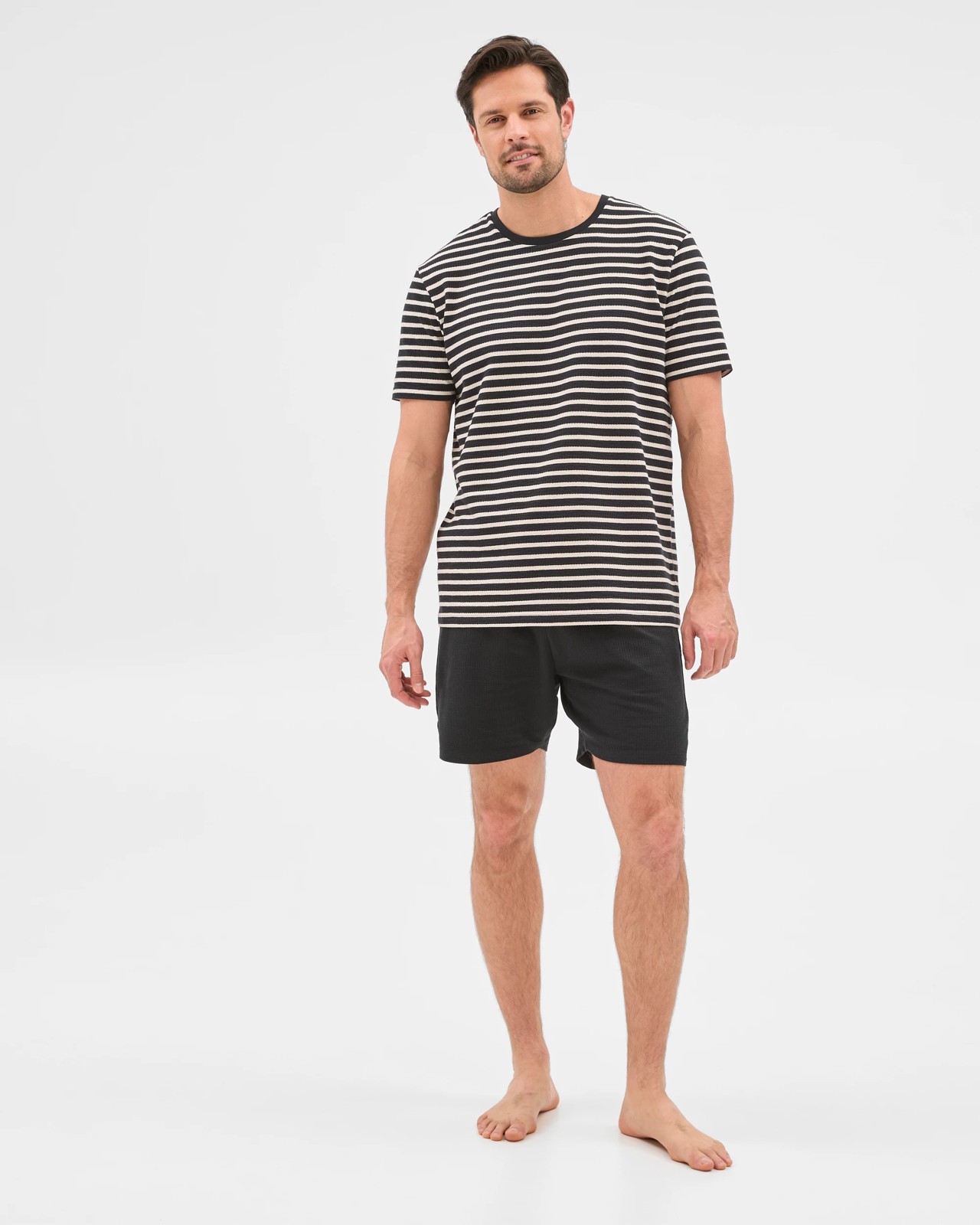 T-shirt: all over black/pumice stone stripe print, 100% Australian cotton seersucker jersey 160gsm fabrication, 95% cotton/5% elastane 240gsm ribbed crew neckline, short sleeves, straight hemline