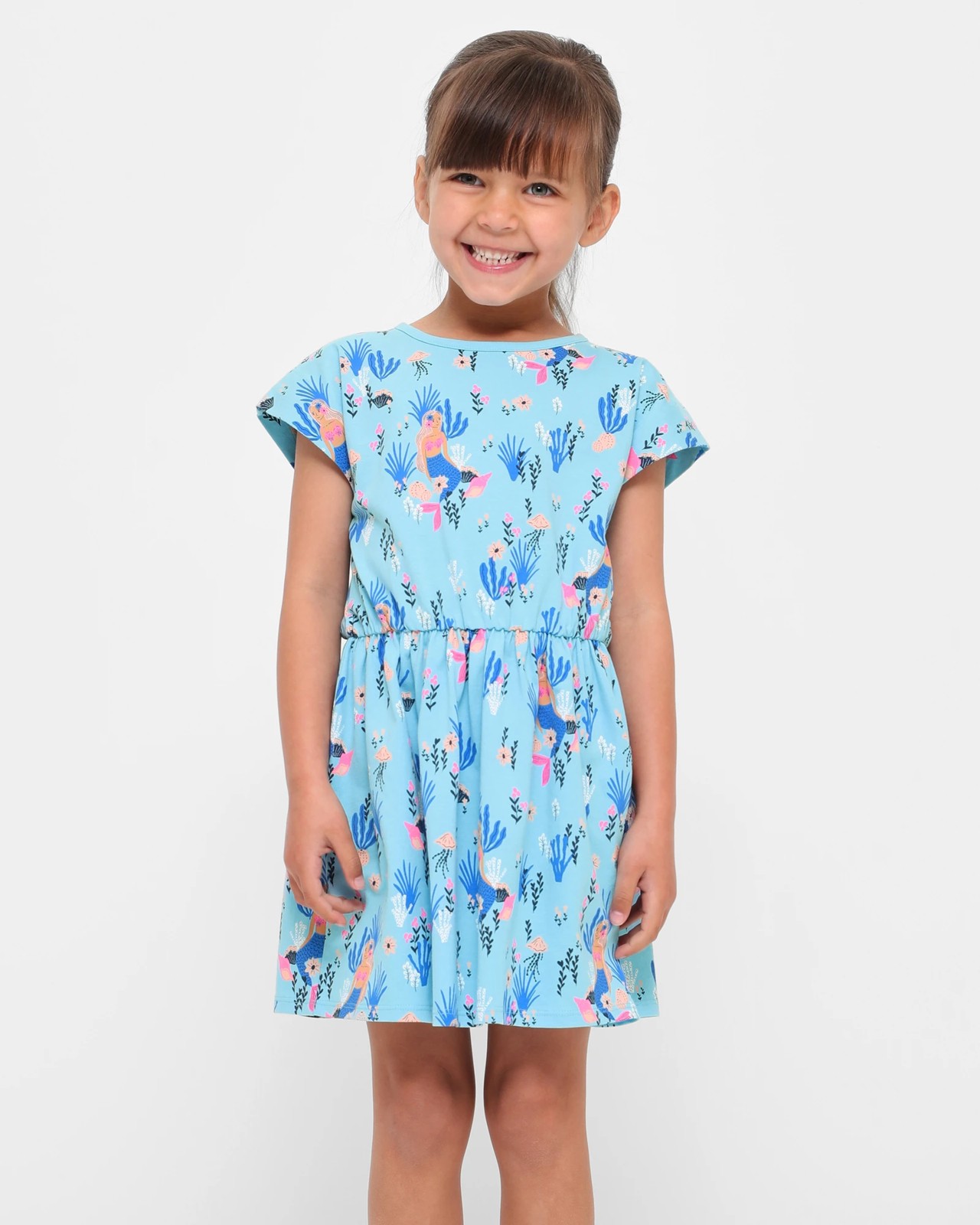 This beautiful dress is made of cotton-rich fabric and has a regular fit. It features an eye-catching blue all over mermaid print, a round neckline, extended shoulder design, and a gathered elastic waistband for added comfort. Perfect for any occasion, this gorgeous dress will make sure that all eyes are on the wearer!