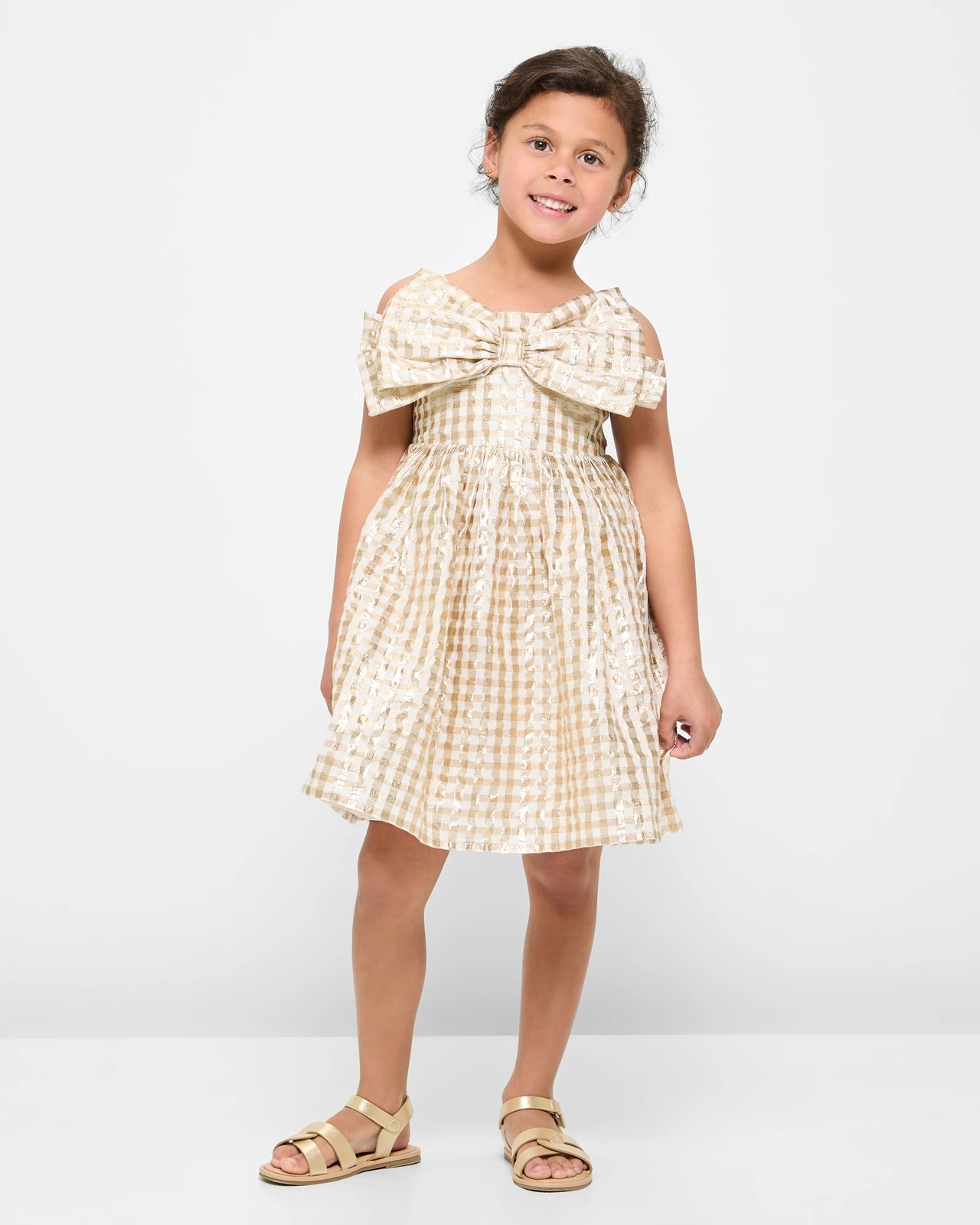 Imagine your little one twirling gracefully in this enchanting Metallic Bow Dress. Made from a comfortable cotton-poly blend, it features a shimmering gold gingham pattern that catches the light beautifully. The wide shoulder straps and elegant bow detail at the front add a charming touch, while the gathered waistband and A-line design ensure a lovely fit. With a back shirred elastic bodice for added comfort and a fully lined interior, this dress is perfect for special occasions and everyday adventures alike. Make her feel like the shining star she is — grab this dress today!