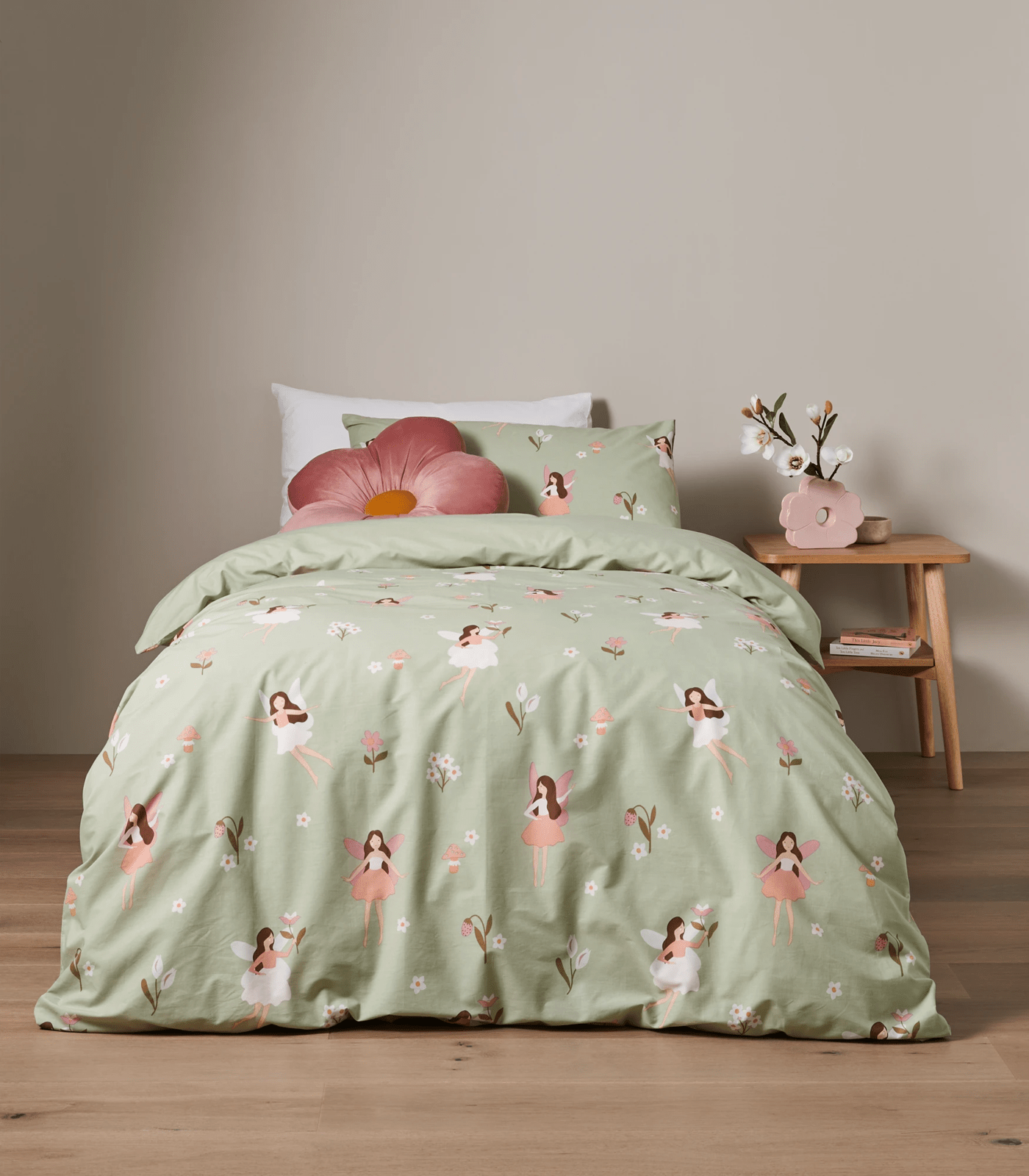The Mia Garden Kids Quilt Cover Set is a fun choice for their bedroom. Featuring a garden fairy design, this green quilt cover and pillowcase set is great for a kids room refresh.
