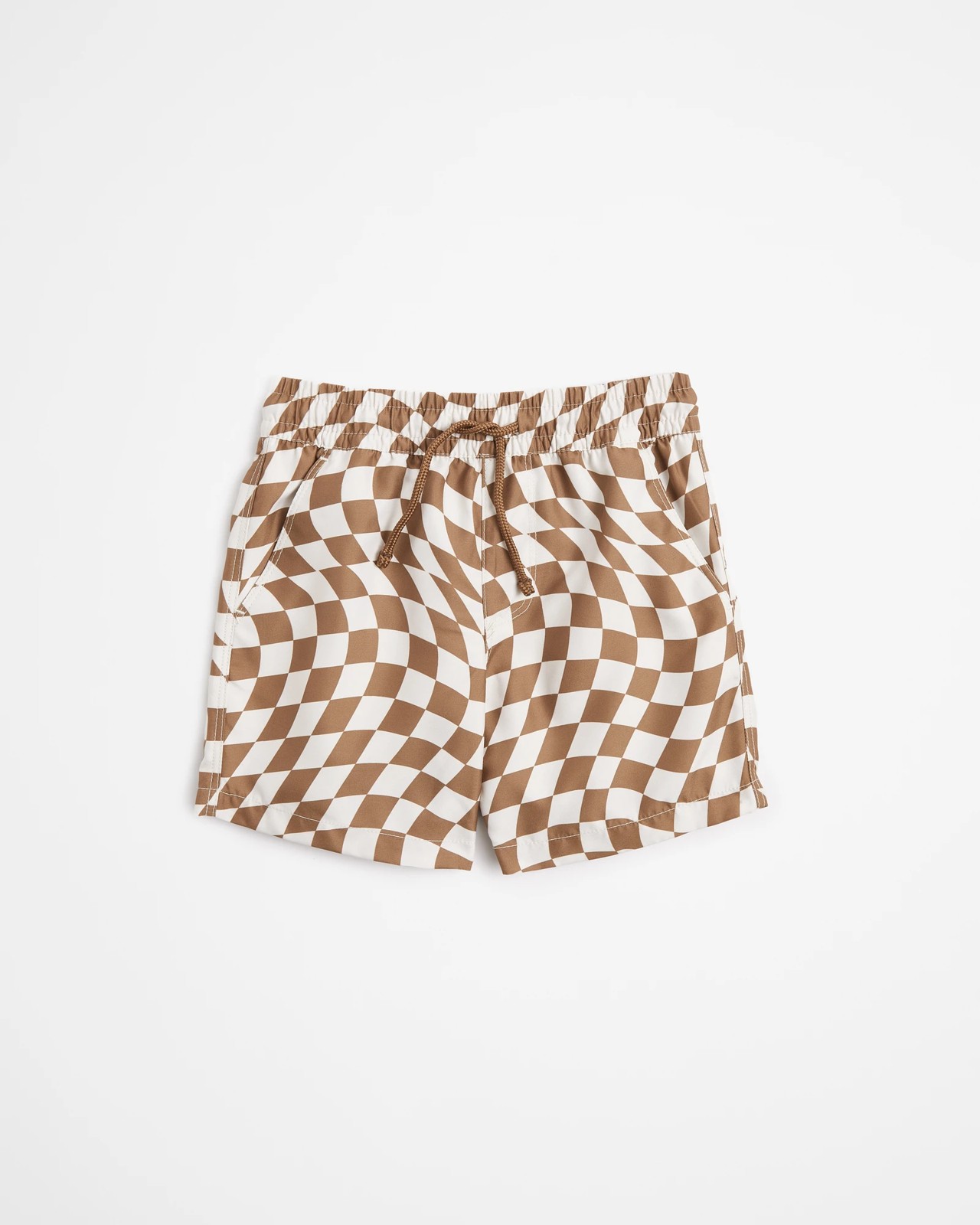 These Microfibre Swim Boardshorts are the perfect choice for summer days spent by the pool or beach! Crafted from quick drying polyester with a regular fit, these shorts feature a stylish brown checkered print with an elastic waistband and drawcord for adjustable comfort. In addition, there are side pockets and a back pocket to keep essentials secure. Make sure to get these kids boardshorts while they last!