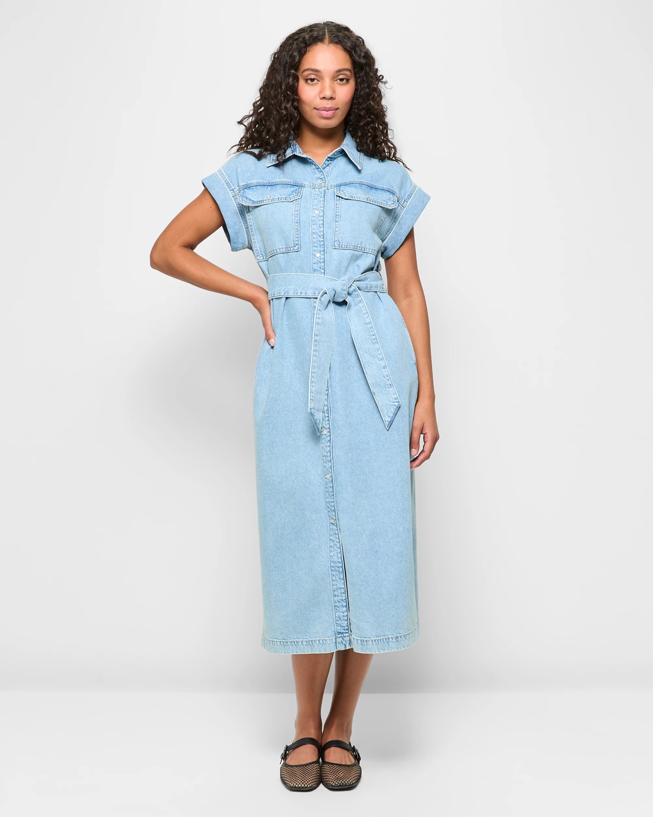 Step out in style with our Midi Denim Shirt Dress. This adaptable dress is made from a soft cotton and lyocell blend that ensures lasting comfort. Featuring a timeless bleach blue shade, it showcases a round collar and pearly press studs for a refined touch. The straight cut and rolled cuff sleeves offer a relaxed yet sophisticated look. With utility chest pockets and a removable tie waist belt, this dress combines practicality with chic appeal. Perfect for casual outings or dressing up, this piece is essential for your wardrobe.